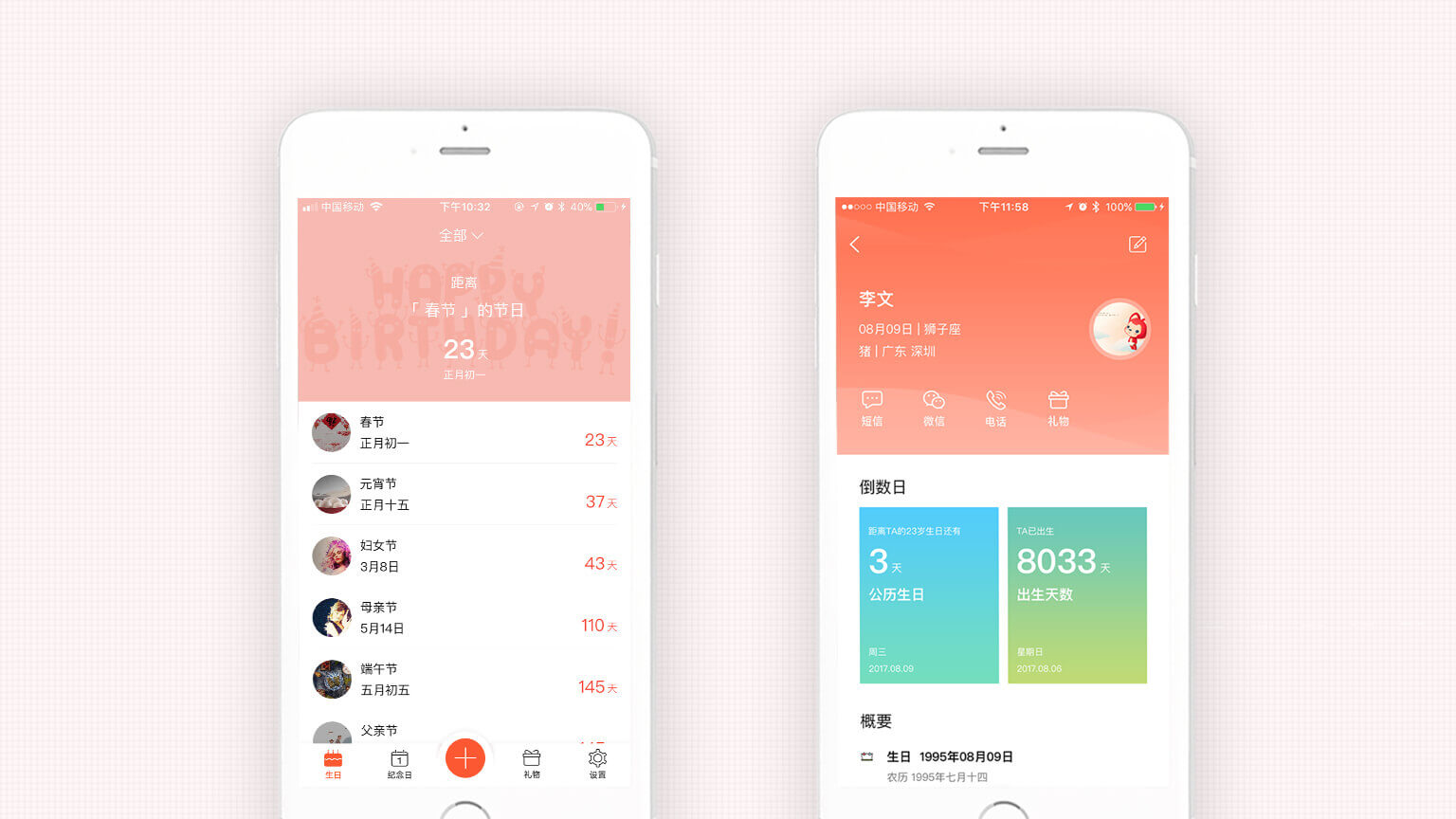 - 生日详情页:支持发短信 · 微信 · 打电话 · 送礼物。