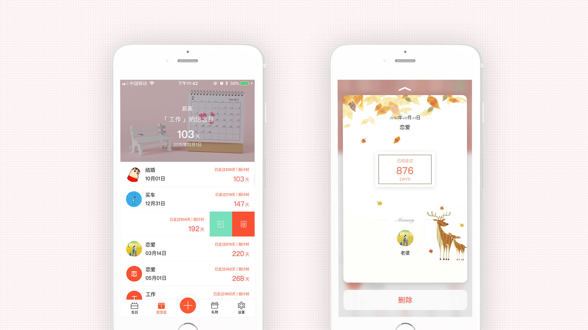 - 纪念日计算,公历农历双支持计算一起走过的日子。