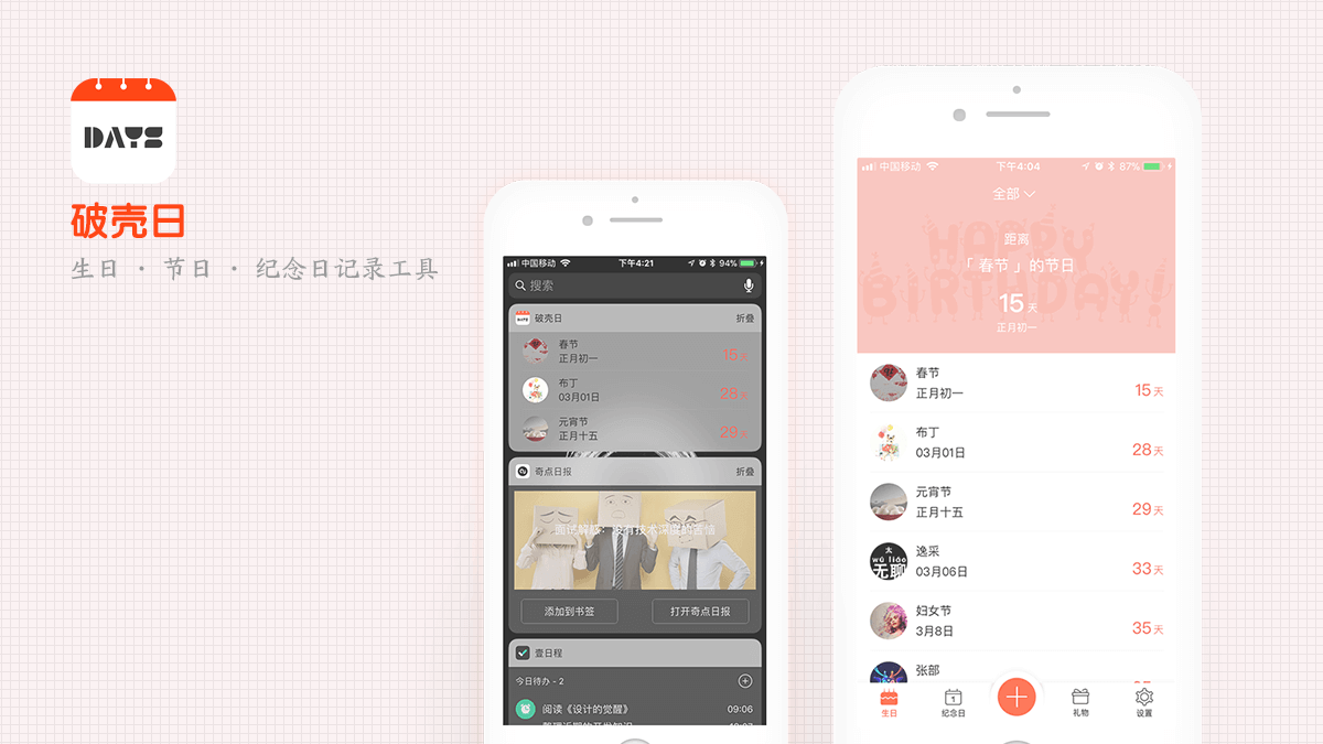 带着用户提出的这样一个诉求,我琢磨了一会并且下载了至少6款生日类的App,但没有一款令我特别满意,这里就不一一吐槽了。大概研究了一下做这样一款生日类App需要用到的技术且反复问自己会不会用这样一款App来记录生日,最终的结果就是我打算开发这样一款设计简洁大方、交互自然流畅、操作友好、干净无广告的App,App的名字思前想后最终确定为破壳日,意思就是破壳出生的那一天,这就是破壳日的起源。