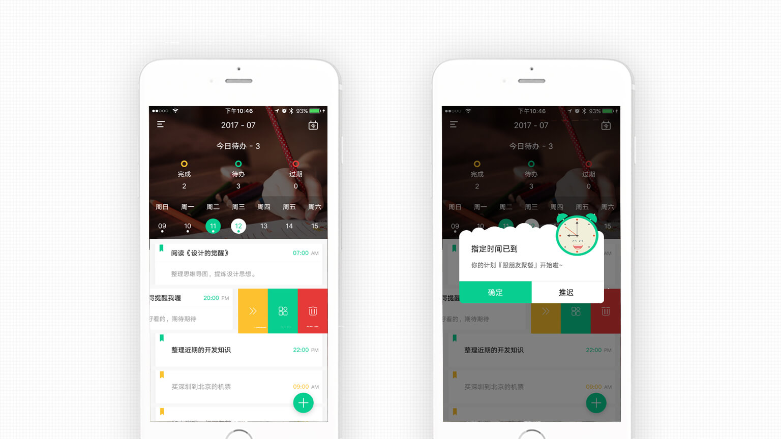 完成、待完成、过期事项一目了然,让你更专注近一周的计划或任务,支持左右滑动、回到今天等功能,选中你计划的日期,点击加号就可以添加选中日期的任务,操作简单明了,同时计划任务也支持修改分类、删除、完成等操作。