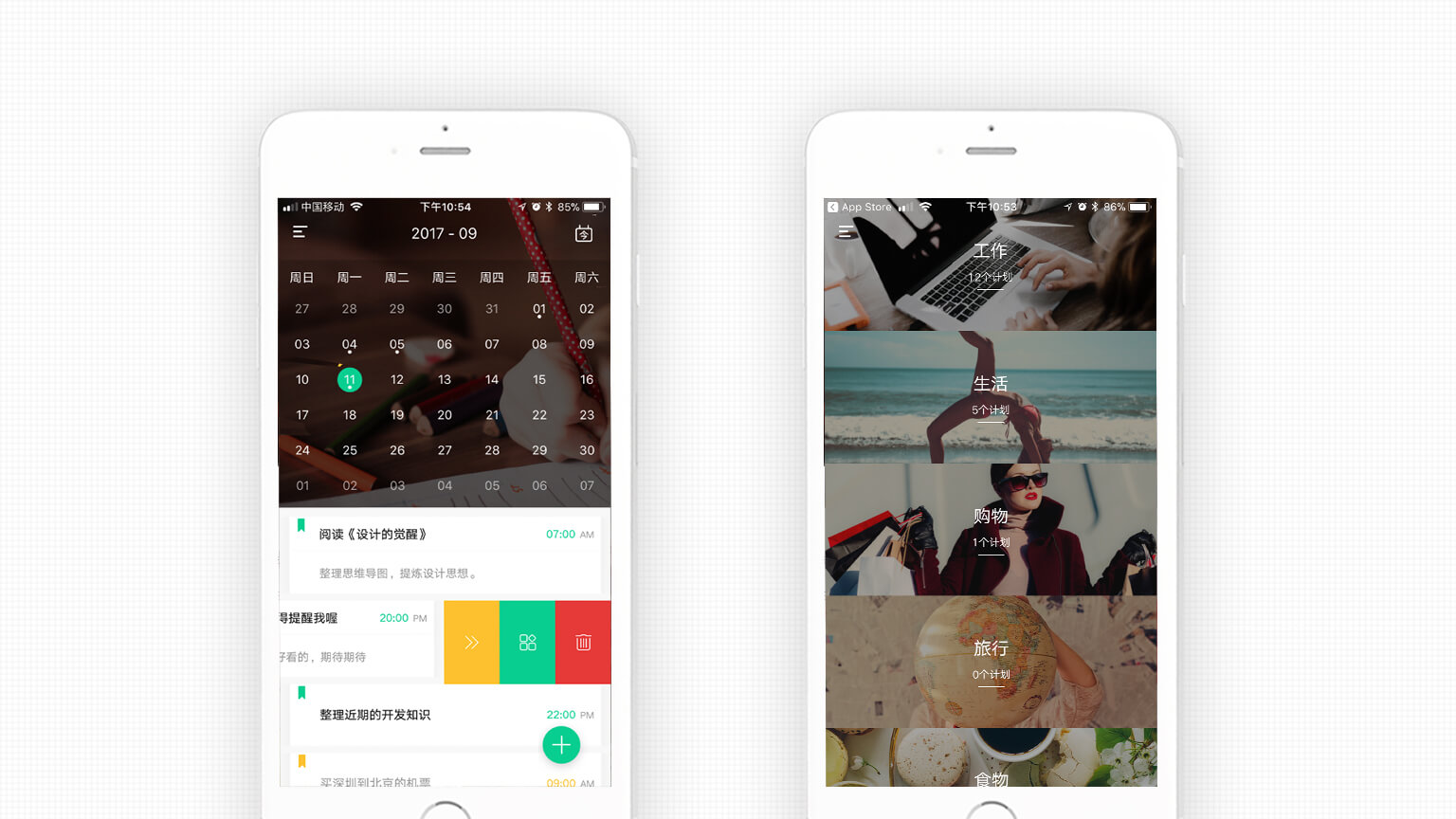 - 日程分类,工作、生活、购物、旅行、食物,一目了然。