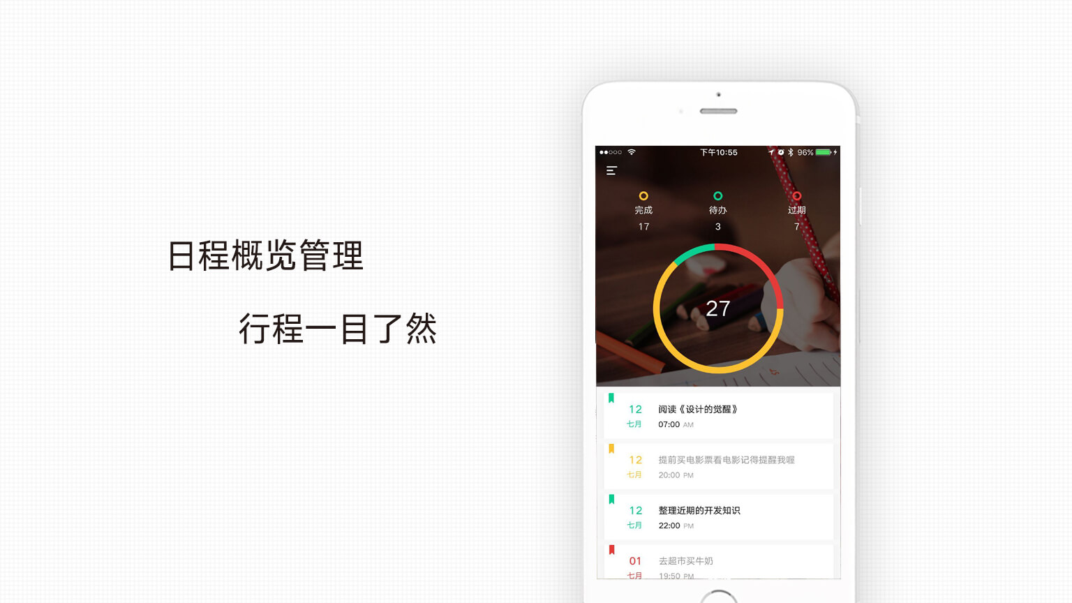 当完成的任务、计划越来越多的时候,我们是否需要一个概览图来看看自己曾经完成的哪些事情,所以App有这样的一个功能供大家查看,概览视图非常直观,根据过期、待办、完成的任务进行排序