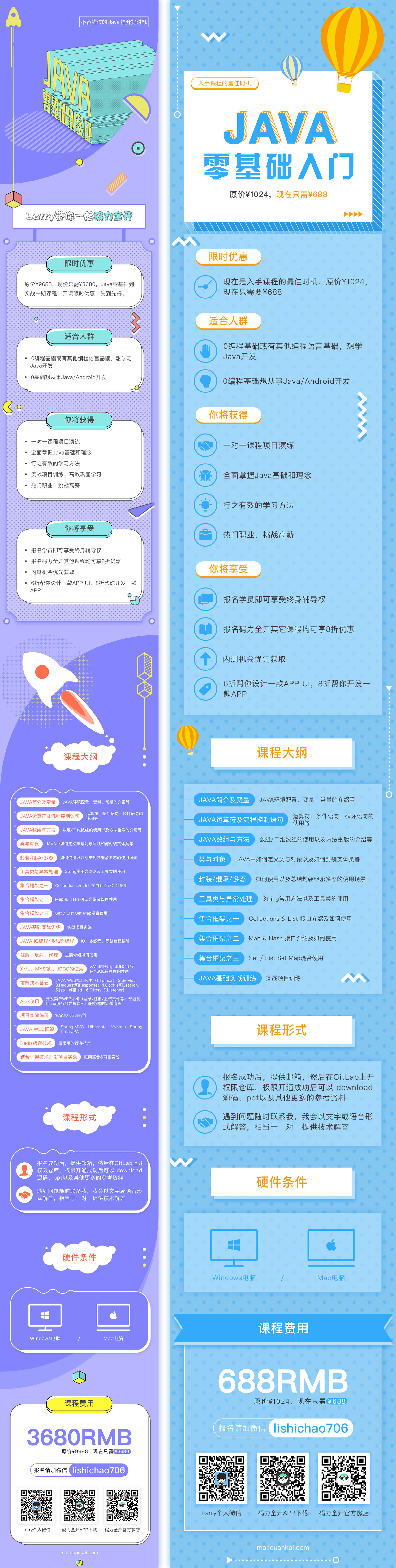 关于课程费用的定价,如果是从0基础开始到项目实战,参考了市面上类似的课程价格,iOS/Android价格基本都在8千左右,Java价格基本都在1w左右,而我的iOS课程定价仅1024元(程序员节日),Android课程价格只有1688元,Java课程只有3688元,可能有些人要问为什么价格这么低,主要有以下两个原因吧: