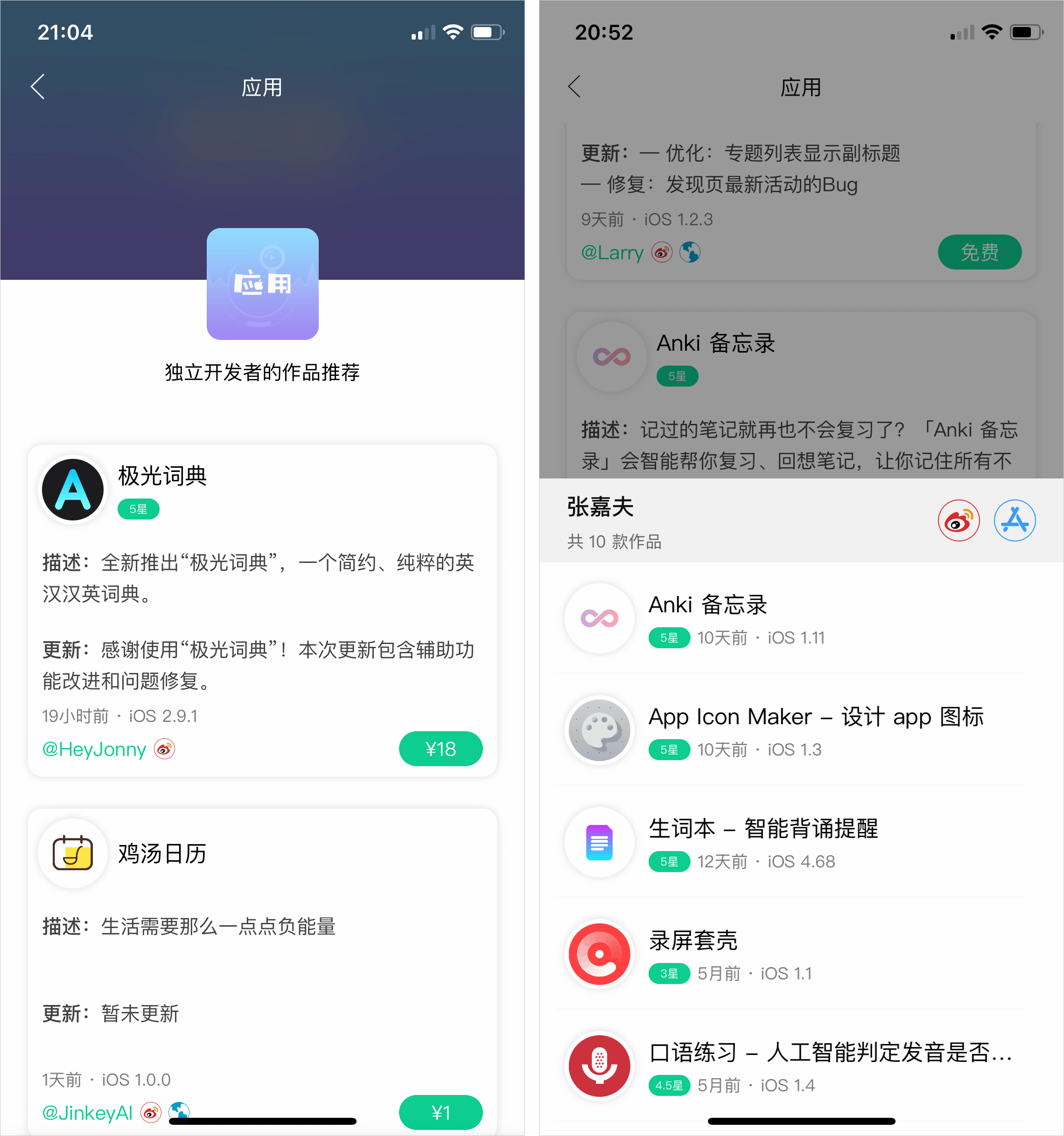 近期我结识的一位非常用心拥有10款个人作品的开发者@张嘉夫撸了一个网站,中国iOS和macOS的独立开发者作品,收录了中国iOS和macOS的独立开发者作品,按照作品的更新顺序排列,并且提供了开发者的微博/GitHub/网站等联系方式,和他简单聊后,结合了他的这个想法,把它移植到了App端(也就是码力全开App),码力全开最初上线有作品推荐一栏,但挂载的是我自己开发的App,现在首页多出一个应用专题专门收录展示中国独立开发者的作品,目前数据还不完善(应该是这几天提交版本,能不能过审就听天由命了)。