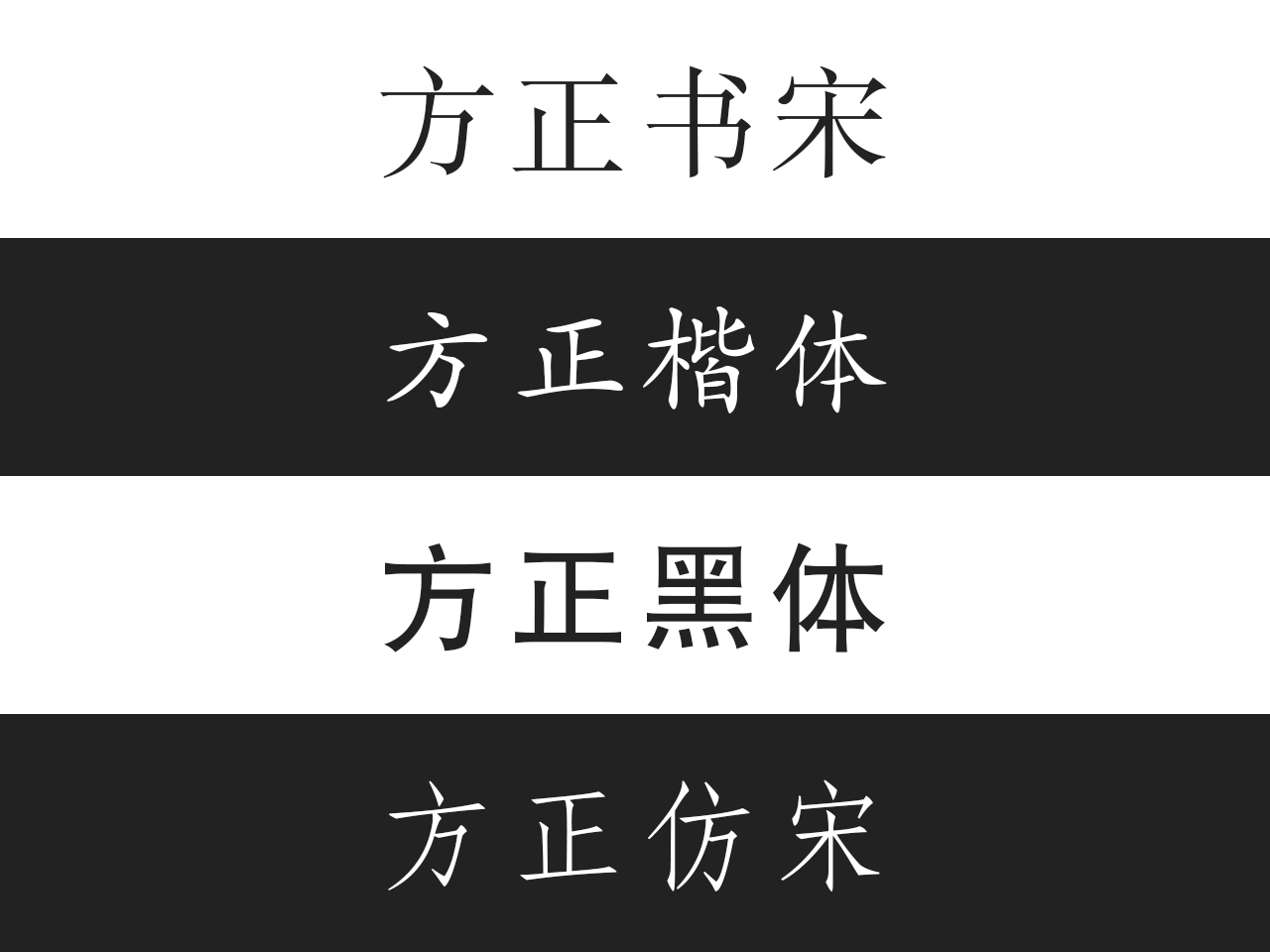 方正字体是大家接触最多的字体之一,其中有4款是方正字库针对「商业发布」提供的免费字体:方正黑体、方正书宋、方正仿宋和方正楷体,需要注意的是这4款字体虽然可商用,但依然需要方正公司的书面授权。