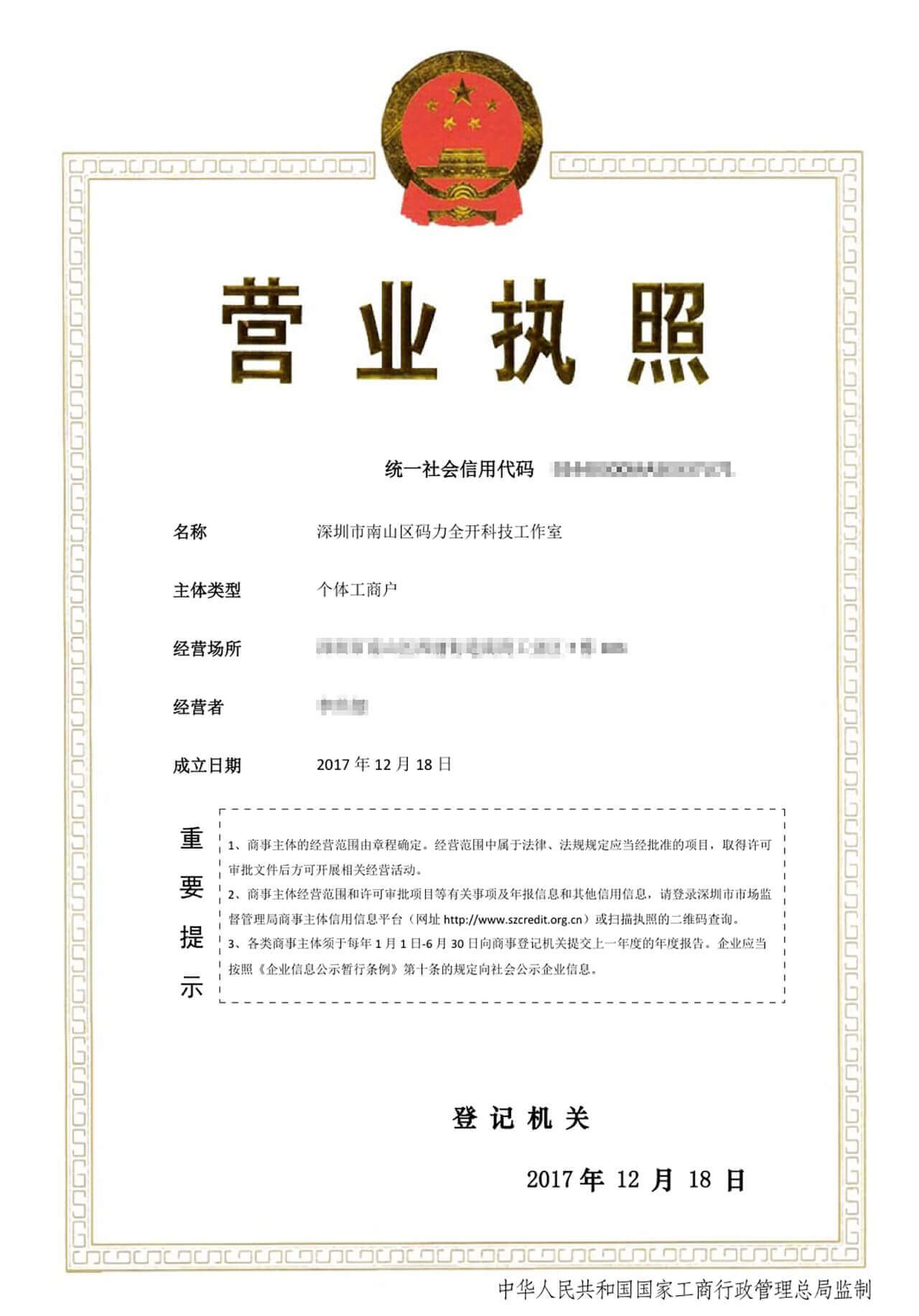 营业执照上码力全开工作室的成立时间是2017年12月18号,一眨眼,码力全开工作室成立一周年了,感叹时间过的真快。