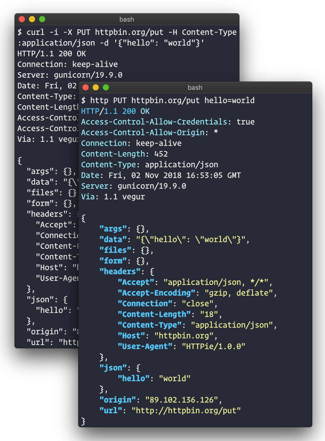 下面的是 cURL 和 httpie 的返回结果对比图: