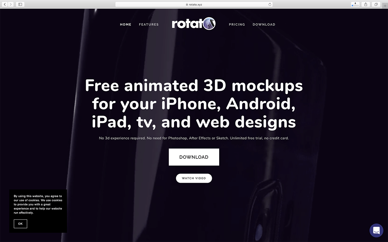 打开网站首页,能看到关于软件的相关介绍以及黑色背景上的手机模型视频,点击页面中的DOWNLOAD按钮进入下载页面,你也可以点击WATCH VIDEO 按钮观看官方给出的操作演示视频。