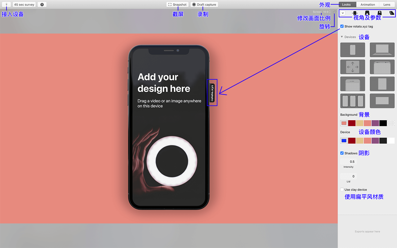 选择展示设备(手机、电脑、iPad)、设置设备展示视角、修改背景颜色、设备颜色、调整样机阴影及扁平材质。