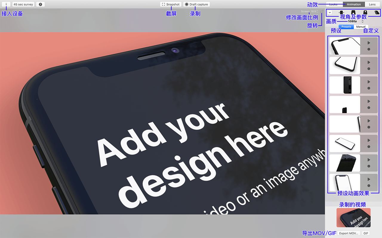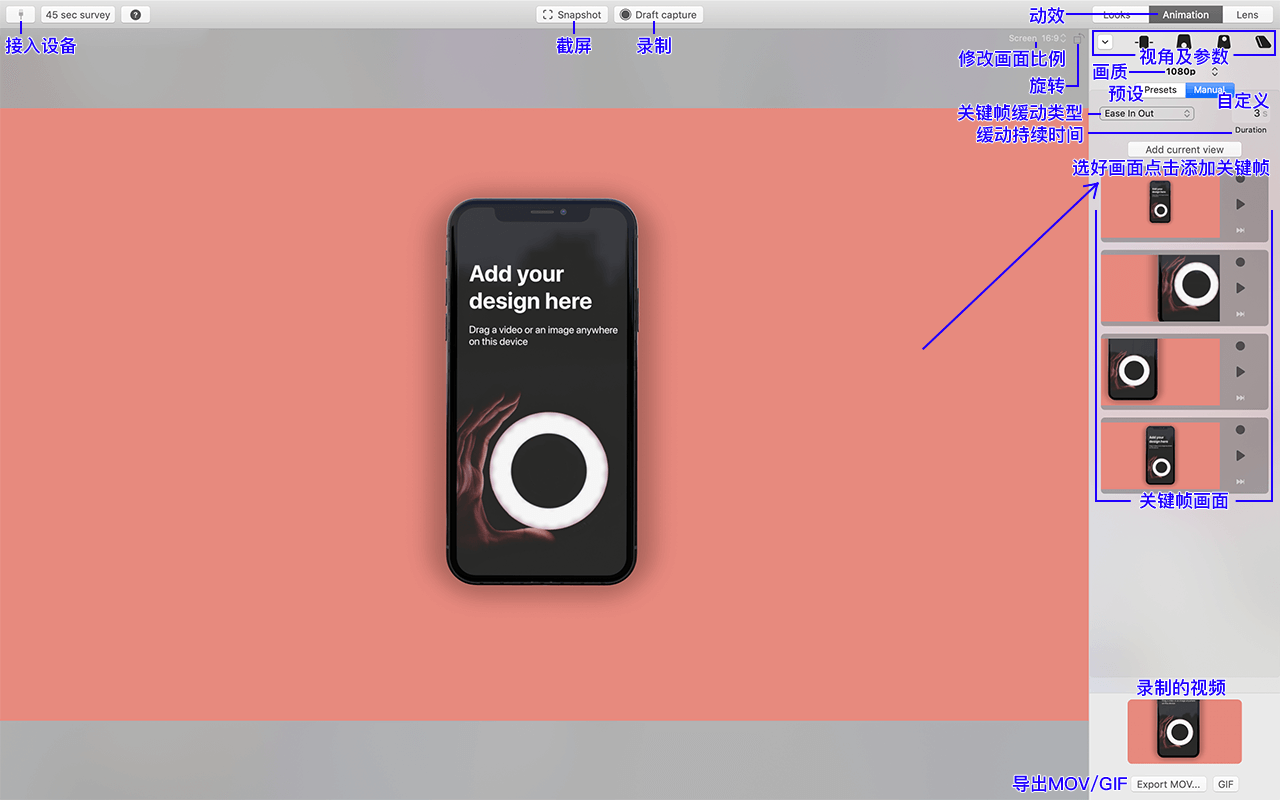 设置调整好Looks相关参数后,可以进行动效设置,点击页面顶部的「Live capture」录制视频,然后在动效预设里选择播放你喜欢的预设动画效果,你的UI界面将按预设动画效果进行视频播放,再次点击页面顶部的「Live capture」录制视频按钮完成视频录制,录制好的视频在页面的右下角,你可以直接拖入其他软件中作为素材使用,也可以导出高清视频MOV格式或者导出GIF格式。