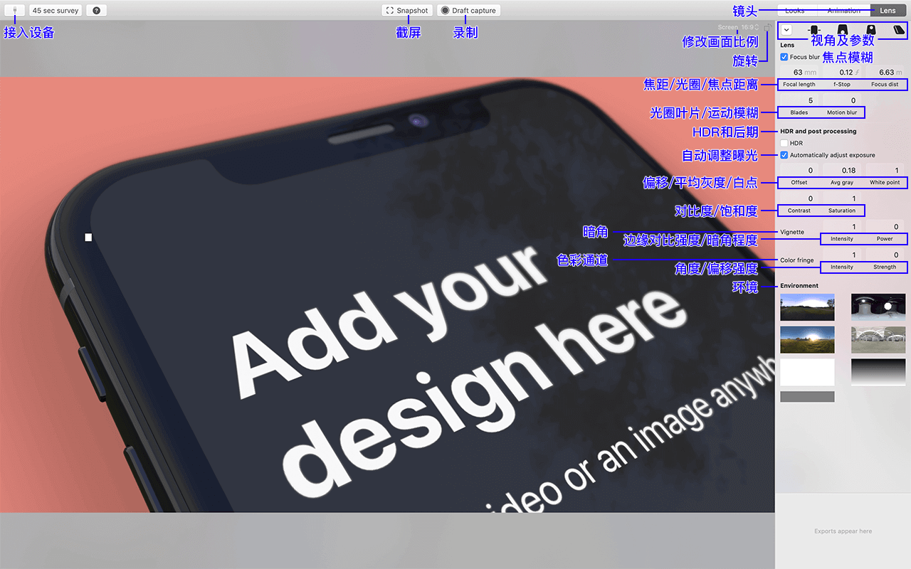 Lens镜头包含一些摄影参数,通过调整焦点、焦距、景深等能让你的展示效果更有空间感,同时在效果里加入环境反光效果让展示更真实。