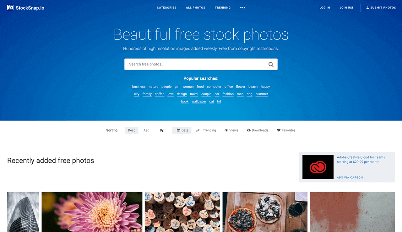 StockSnap 免费提供精美、高品质的照片,并且每周增加数百个高分辨率图像,你可以将图片免费运用到个人或商业用途。StockSnap 分类较为齐全,除了常规分类、热门搜索外,还提供按日期、趋势、查看量、下载量以及用户喜欢量来浏览图片。