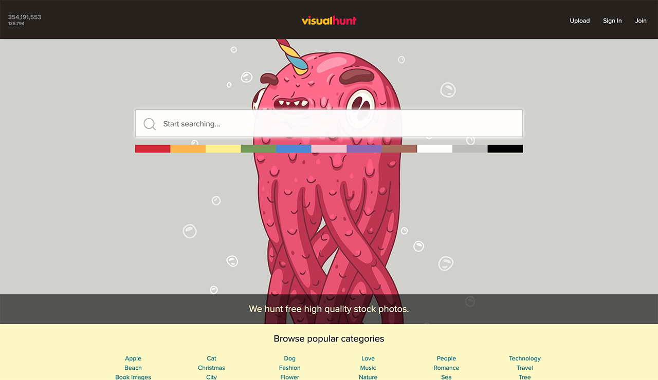 Visualhunt 拥有3亿多张高品质免费照片,网站寻找来自许多在线资源的最佳免费图像,并将它们全部集中起来,其中大部分照片都有CC0许可证,你可以免费用于个人或商业用途。网站除了提供关键字搜索外,还提供按照色彩以及热门类别进行浏览。