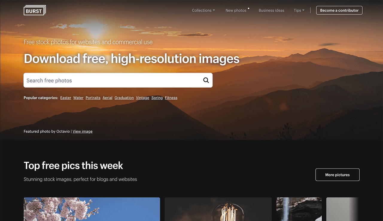 Burst 是由 Shopify 提供支持的免费照片平台,图像库包含数千个由全球摄影师社区拍摄的高分辨率、免费图像,你可以将图片用于个人或商业用途。