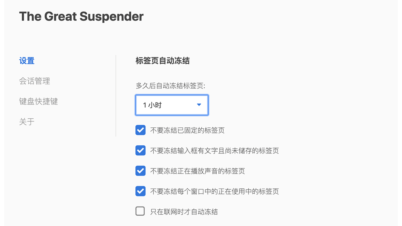 The Great Suspender 是一个轻量级的扩展插件,当你同时打开多个标签,在可配置的时间长度之后未被查看的选项卡将在后台自动暂停,从而释放该选项卡占用的内存和CPU,减少Chrome的内存占用,使计算机顺利运行。