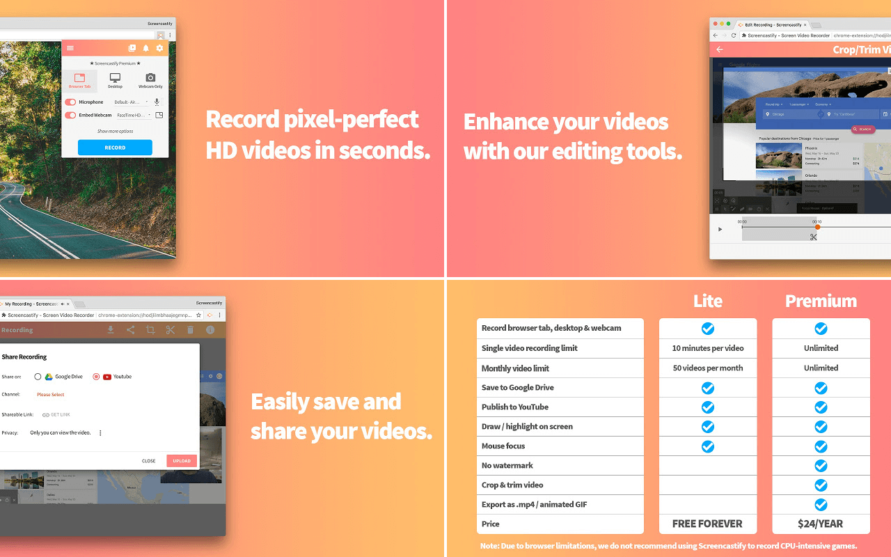 Screencastify是一个轻量级Chrome扩展程序,能够捕捉整个桌面、浏览器选项卡或网络摄像头录制流畅/高清视频,你可以在录制时使用外部麦克风或网络摄像头添加旁白,精简免费版支持录制视频时长10分钟,每月50个视频,付费后视频时长及数量无限制,并且还可以对录制好的视频进行修剪和编辑,支持合并多个视频、剪切/分割剪辑视频、导出为.mp4/动画.gif。
