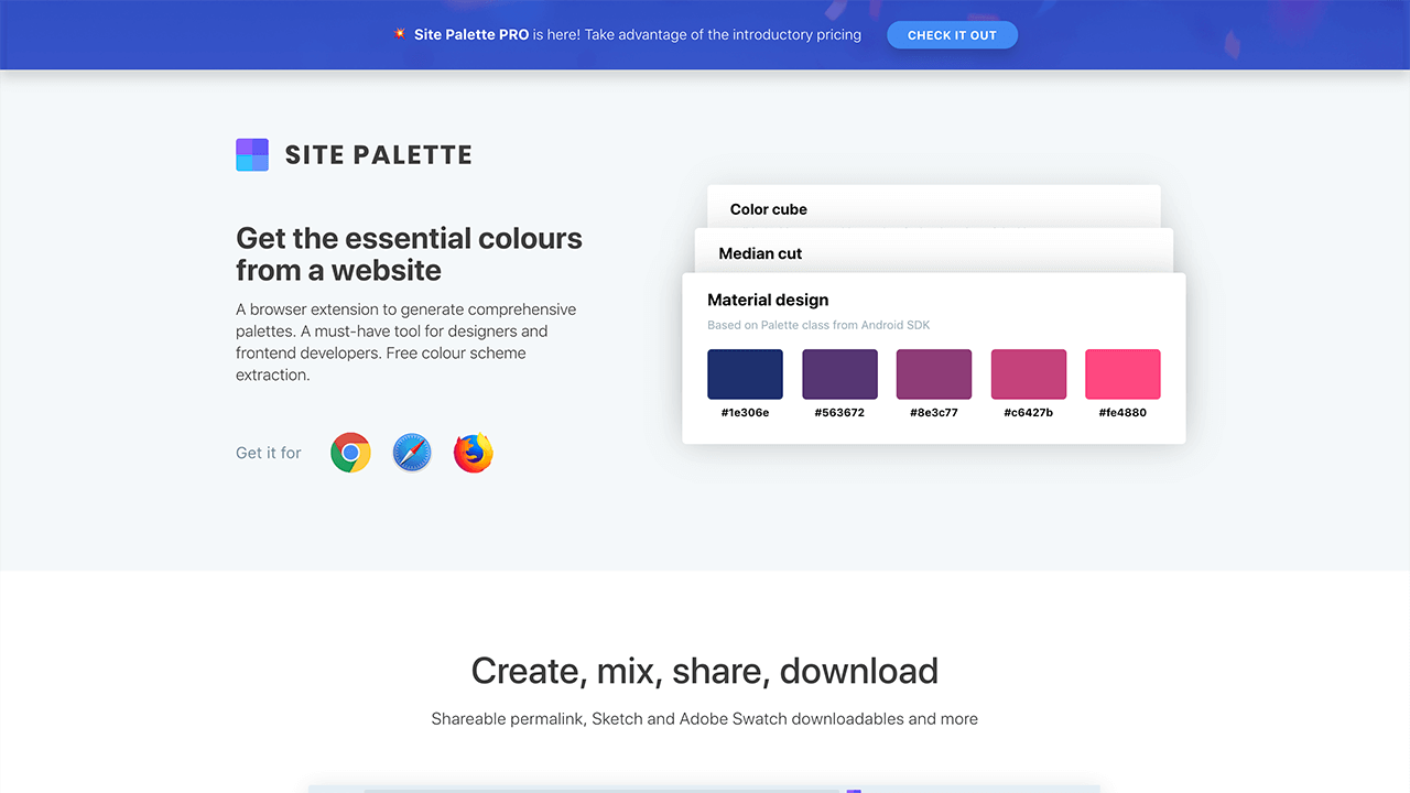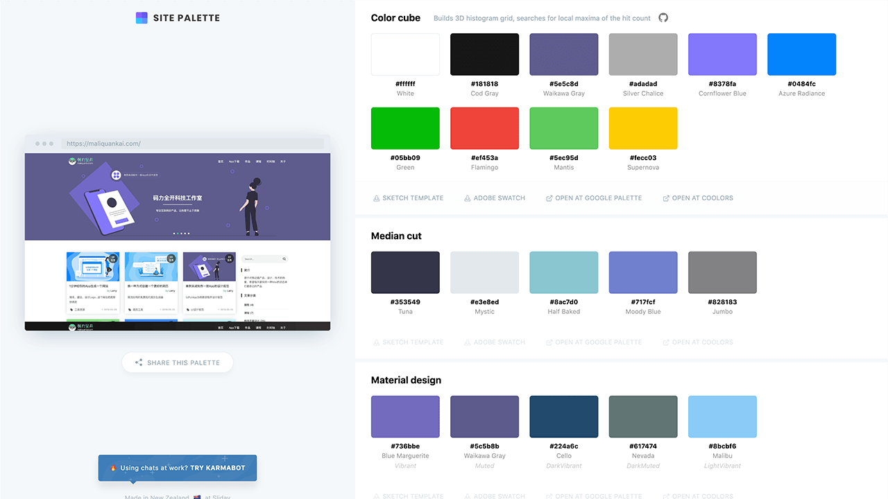 Site Palette是一个浏览器插件,支持Chrome、Safari、Firefox三大浏览器,通过Site Palette插件可以自动提取任何网站的配色,并且生成Color cube、Median cut、Material design三种不同取色模式。
