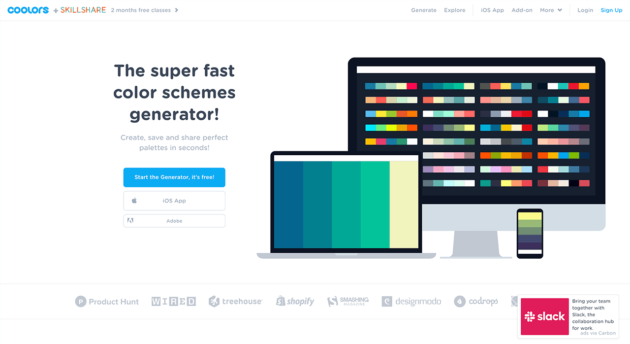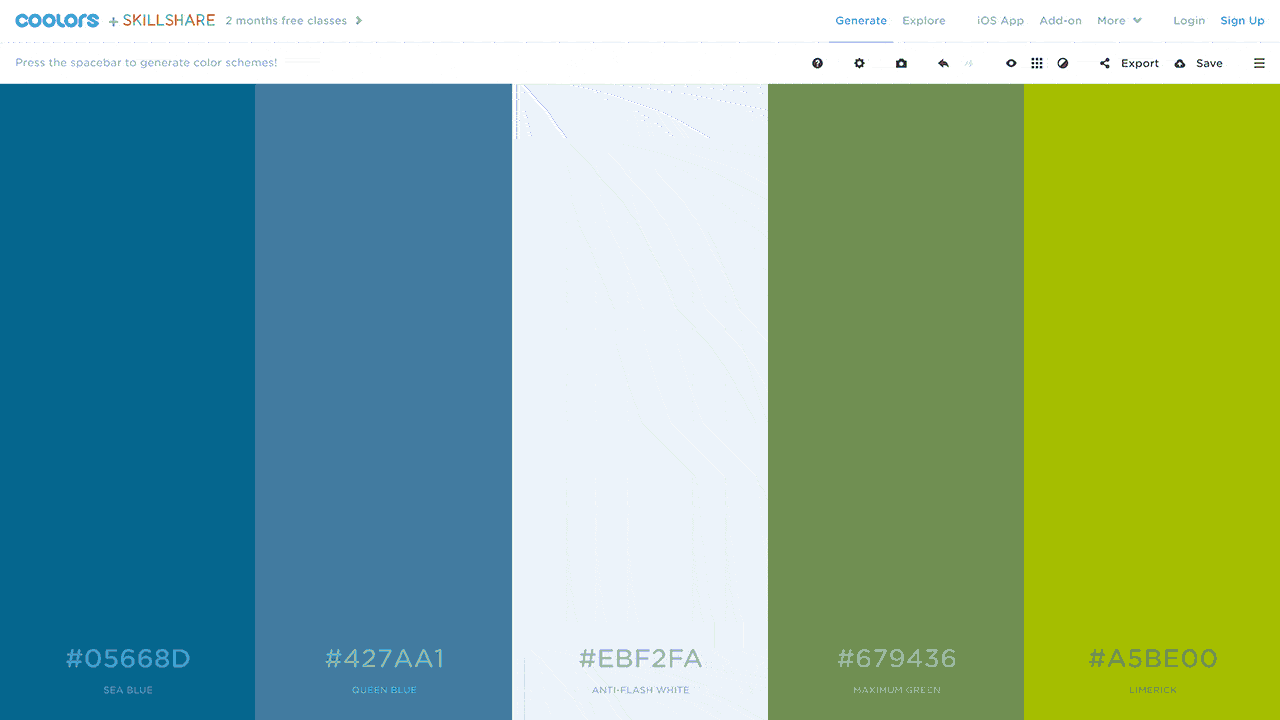 点击「Start the Generator,it’s free!」按钮进入配色方案生成器页面,只需要按空格键网站就能随机生成配色方案给你。