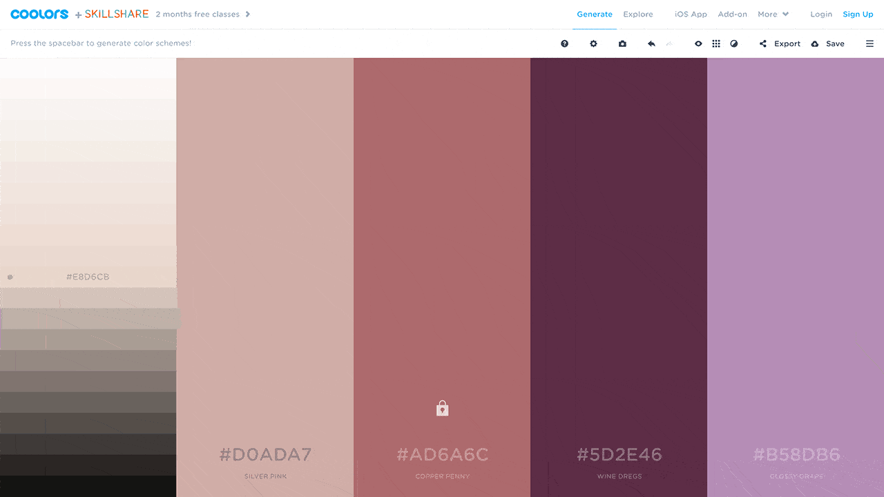所有颜色支持你快速替换调整色彩模式、色调、饱和度、亮度,对于选中的颜色你也可以将其锁定,再次按空格键网站会将你锁定的颜色保留自动生成其他颜色的配色方案给你。点击每个色块的十六进制色值能快速将其选中,你可以复制色值也可以对其再次编辑,点击「Export」按钮,你还可以对调色板进行分享及下载,支持格式:URL、PDF、PNG、SCSS、SVG及COPIC马克笔色号。