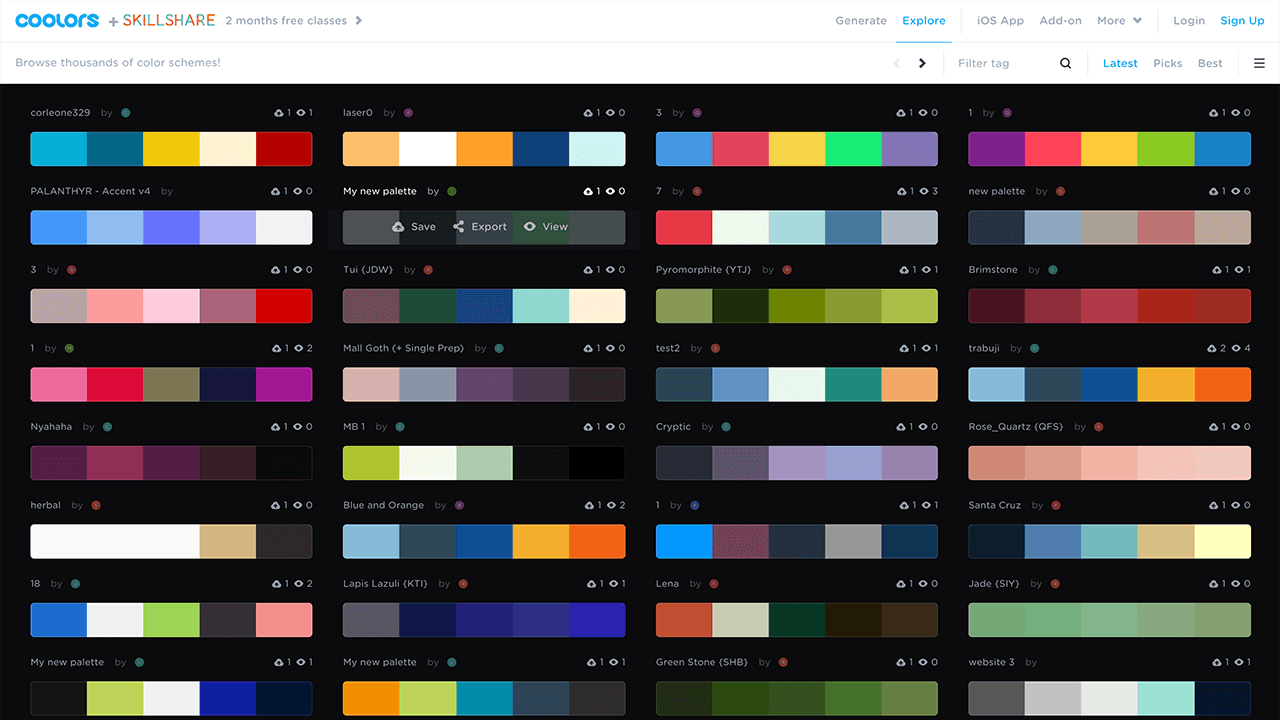 在EXPLORE探索模块,网站提供了数以千计的配色方案供你浏览借鉴,这些配色方案大都来自于Coolors用户,当然你也可以注册登录创建分享你的配色方案,或者存储查看下载编辑网站及其他用户提供的配色方案。