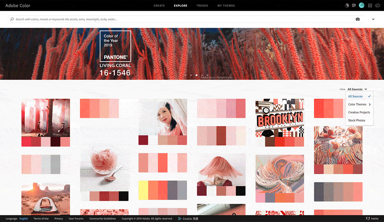 在EXPLORE探索模块,网站提供了来自Adobe Stock和Behance中比较优秀的摄影图片及创意项目主题配色方案为你提供配色灵感,你可以通过选择器减小色彩范围,也可以通过关键词去搜索你的配色目标,上传图片搜索类似的色彩主题也是可以的。