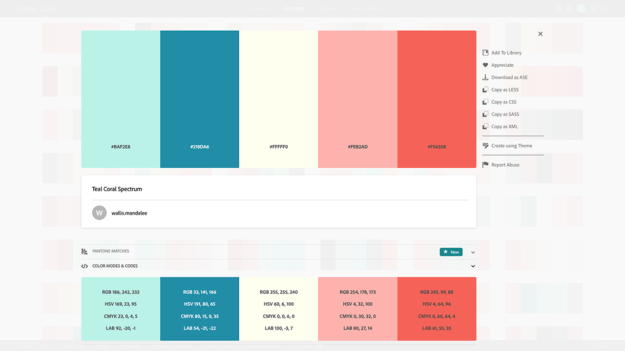 如果发现你喜欢的配色方案你可以直接下载,也可以点进去查看该配色,网站提供了关于配色的十六机制色值、四种色彩模式的详细色值及代码、下载为ASE或JPEG。