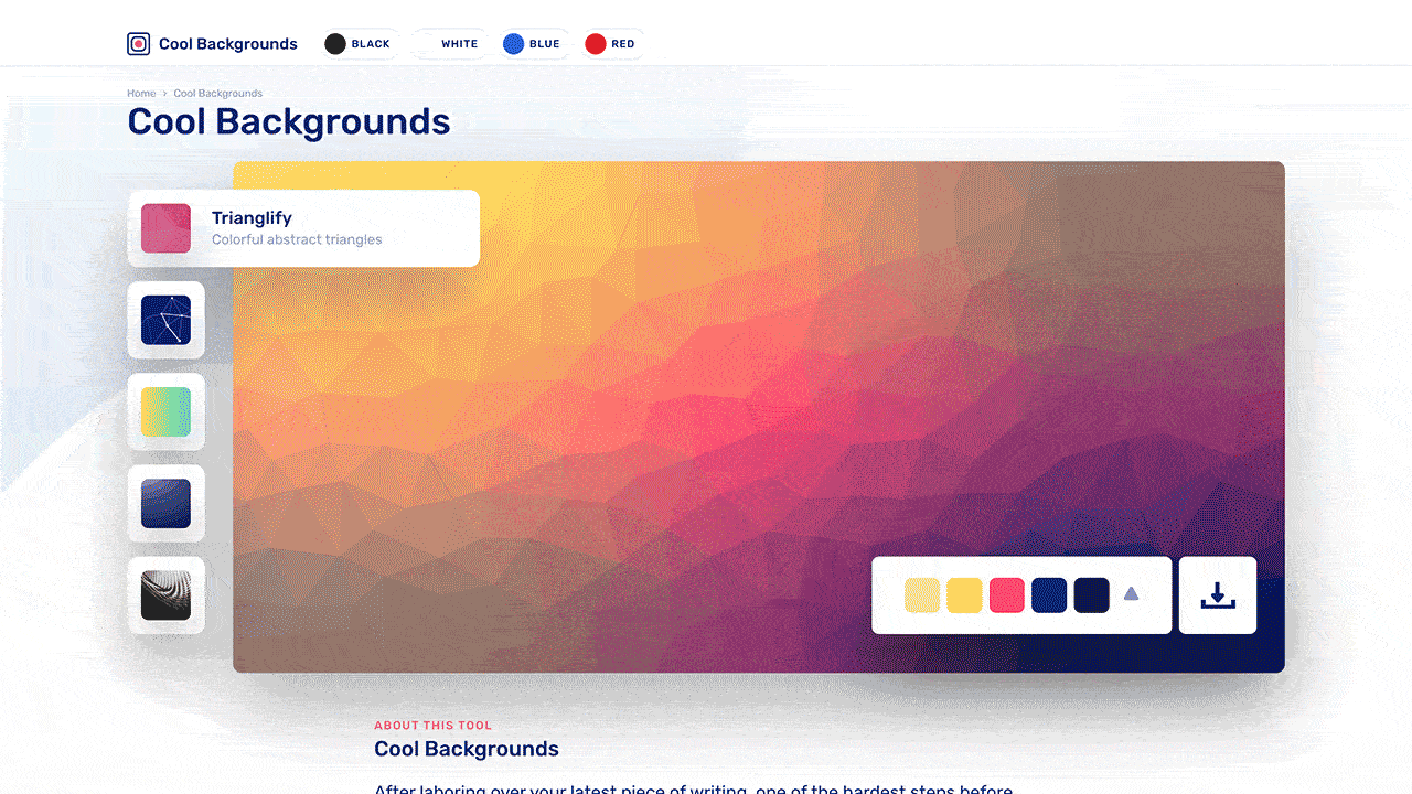 Cool Backgrounds是由旧金山产品设计师Moe Amaya创建的一个包含低多边形、粒子、渐变、梯度地形及Unsplash图像的免费背景素材网站,除默认多色效果外网站还提供了黑、白、蓝、红四种单色效果,根据网站的色彩可以快速调整背景素材的色彩。