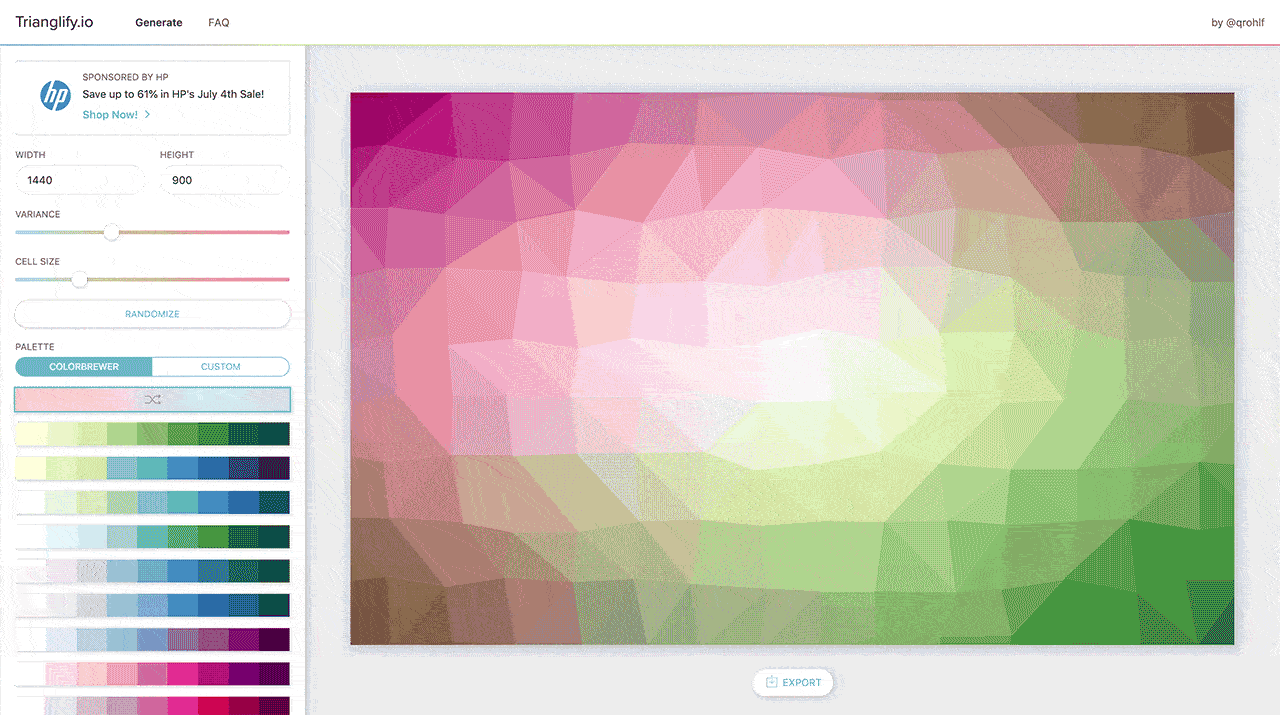 Cool Backgrounds的低多边形背景效果技术支持来源于美国的工程师/设计师Quinn Rohlf开发的低多边形背景、纹理和矢量工具Trianglify.io,通过Trianglify.io可以快速调整背景尺寸、图形方差、多边形大小、配色方案等,调整好的背景支持复制链接、下载PNG和SVG格式。Trianglify.io低多边形生成器工具地址:https://trianglify.io/