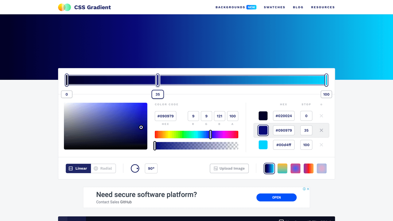 Cool Backgrounds的渐变背景效果技术支持来源于CSS Gradient,同样由Moe Amaya设计开发的CSS渐变生成器,可以快速生成线性和径向渐变及CSS渐变文本。