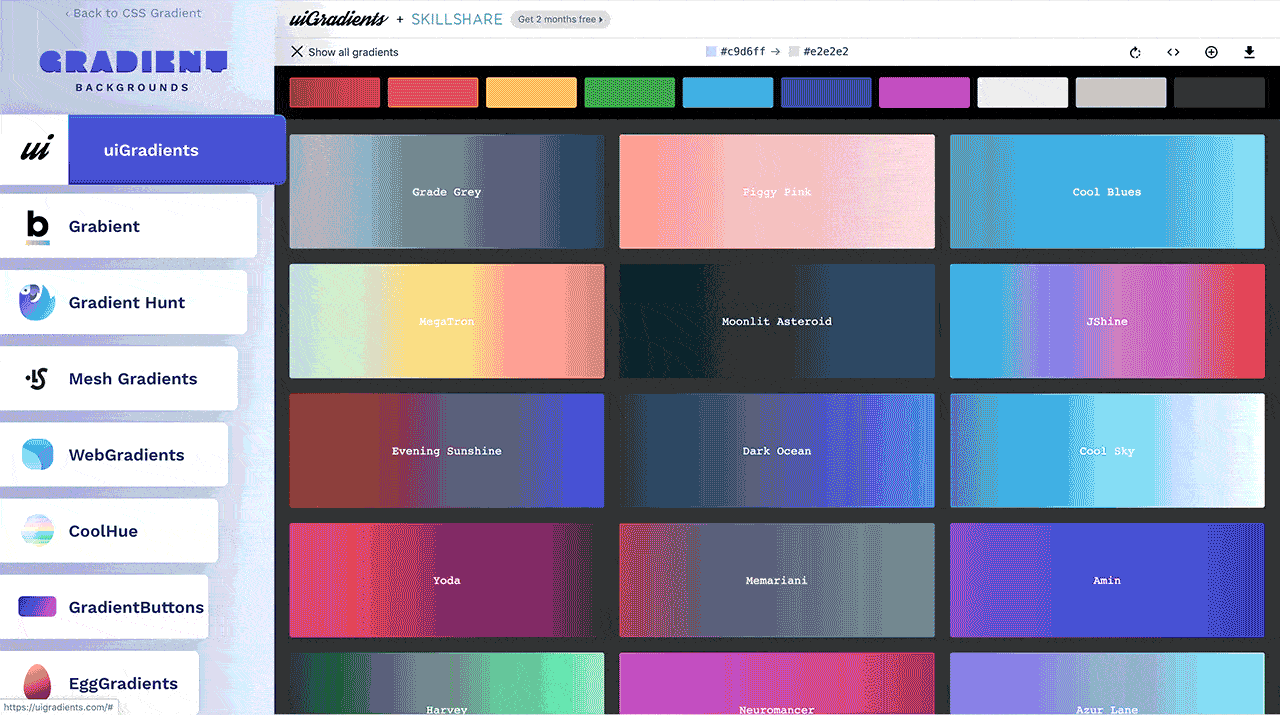 CSS Gradient提供了大量渐变色板图库供你寻找灵感,包括uiGradients、Grabient、Gradient Hunt、Mesh Gradients、WebGradients、CoolHue、GradientButtons、EggGradients、Colorful。