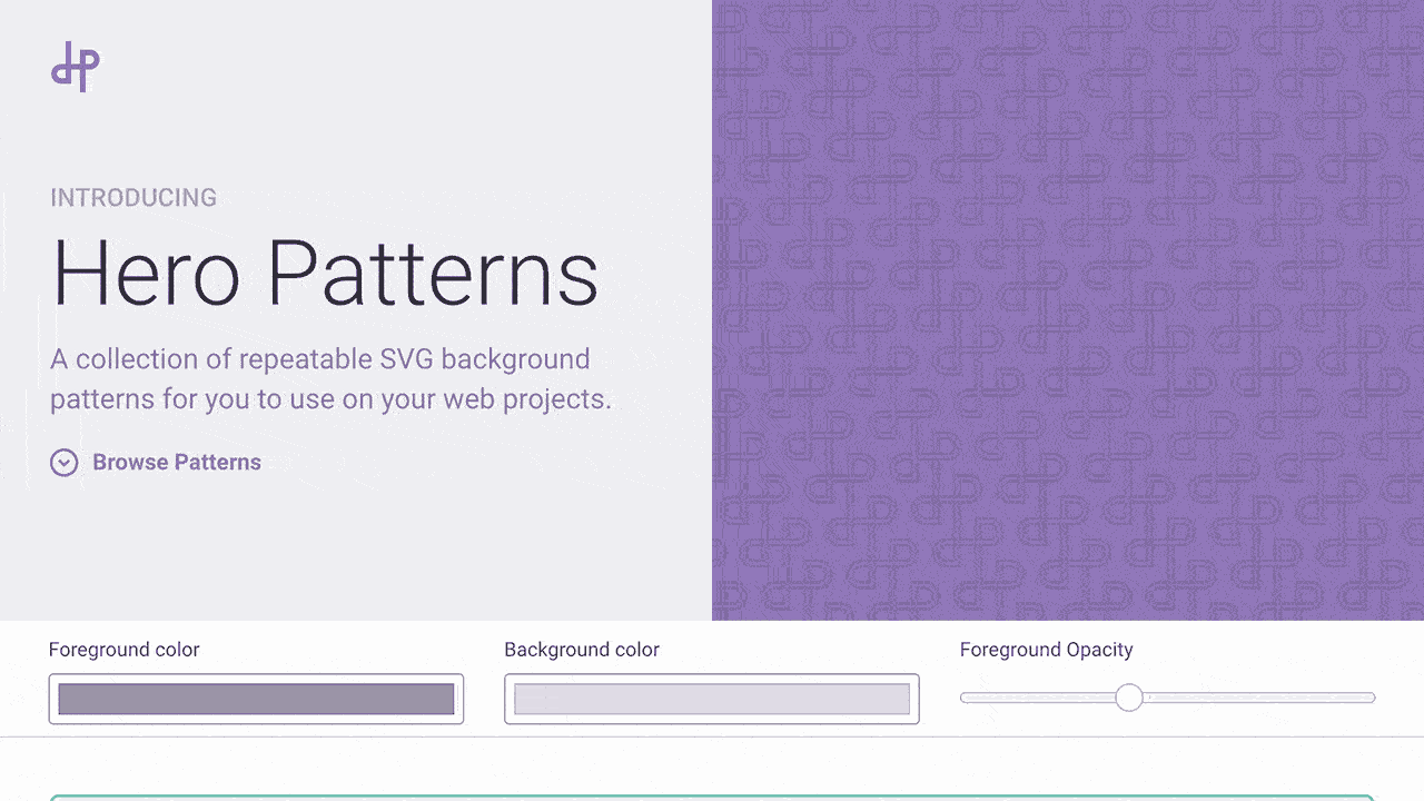 Hero Patterns是由加拿大UI设计师和插画师Steve Schoger创建的一个免费在线SVG背景素材库,支持更改前景色、背景色及前景不透明度,下载没有样式的SVG或生成CSS代码。
