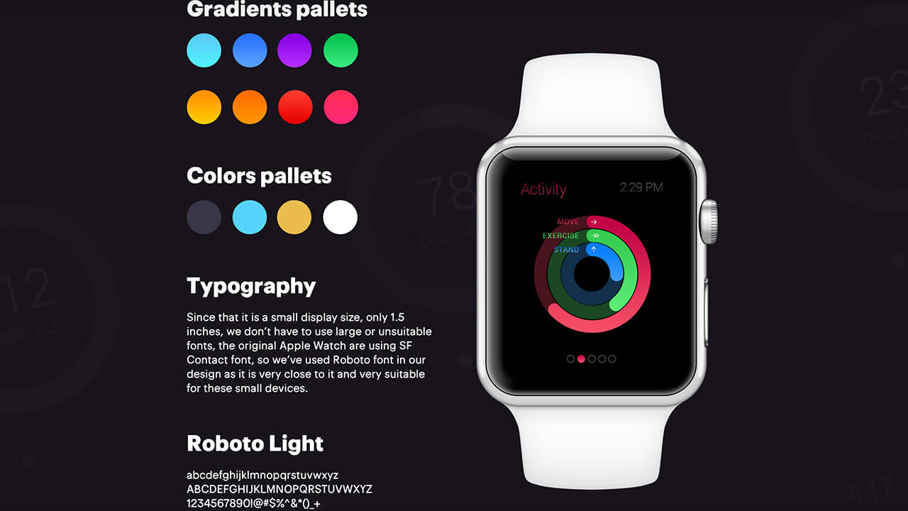 它提供了渐变托盘、颜色托盘、版式布局等,由于它屏幕的限制,我们不适合使用较大的字体,原始的Apple Watch使用的是SF Contact字体,因此我们在设计中使用了Roboto字体,因为它非常接近并非常适合这些小型设备。