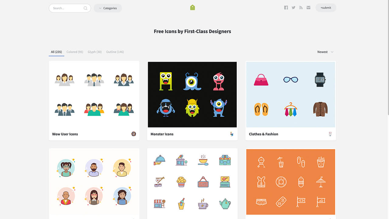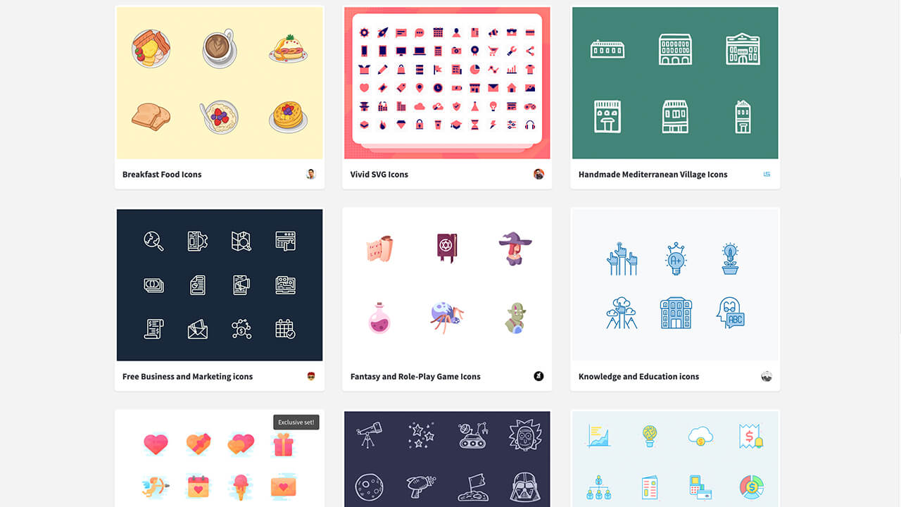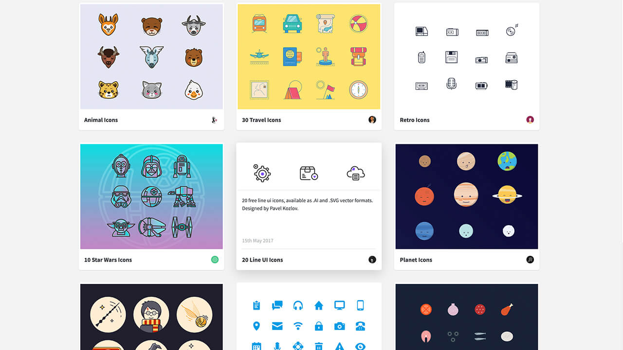 往下继续翻可以看到很多个分类的项目图标,而且大多数图标质量都很高,每个项目的左下角是图标项目名称,右下角是作者的头像。