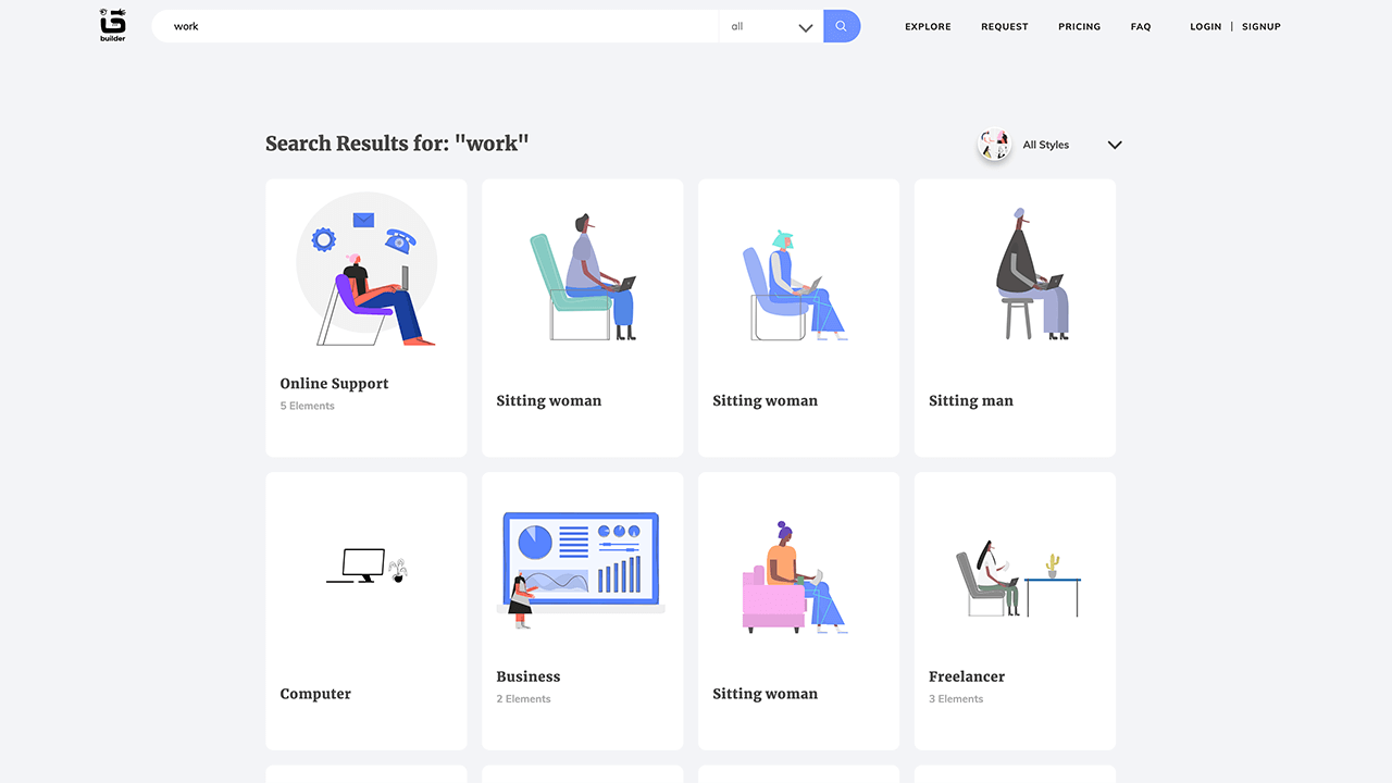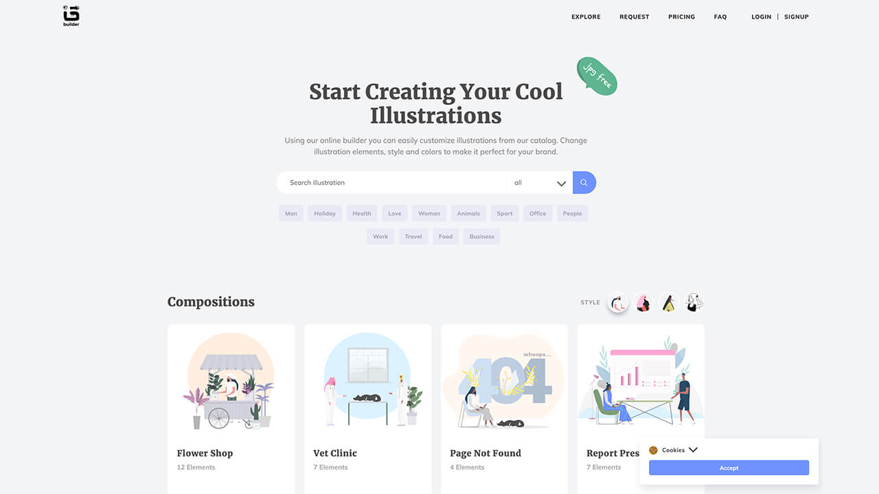 打开网站,可以看到大标题就是开始创建漂亮的插图,使用在线构建器,您可以轻松地更改插图元素、样式和颜色来定制插图,同时提供了搜索入口。