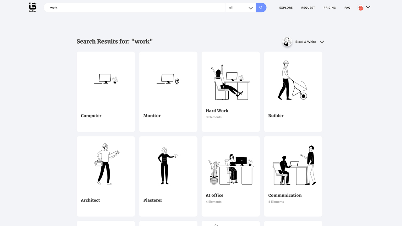 首页和搜索后的页面右侧都提供了选择插画样式的入口,可以选择普通、巨人、黑/白等四种样式的插画,比如:我们选择黑/白样式的插画。
