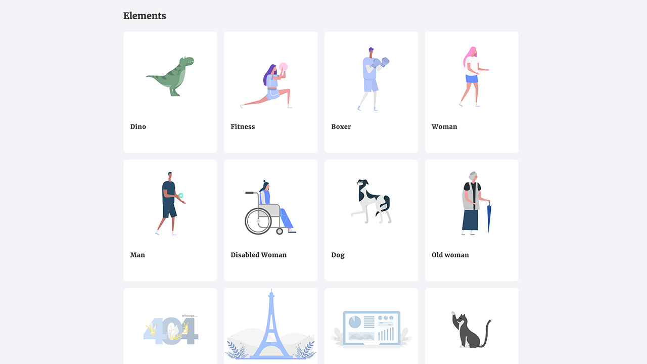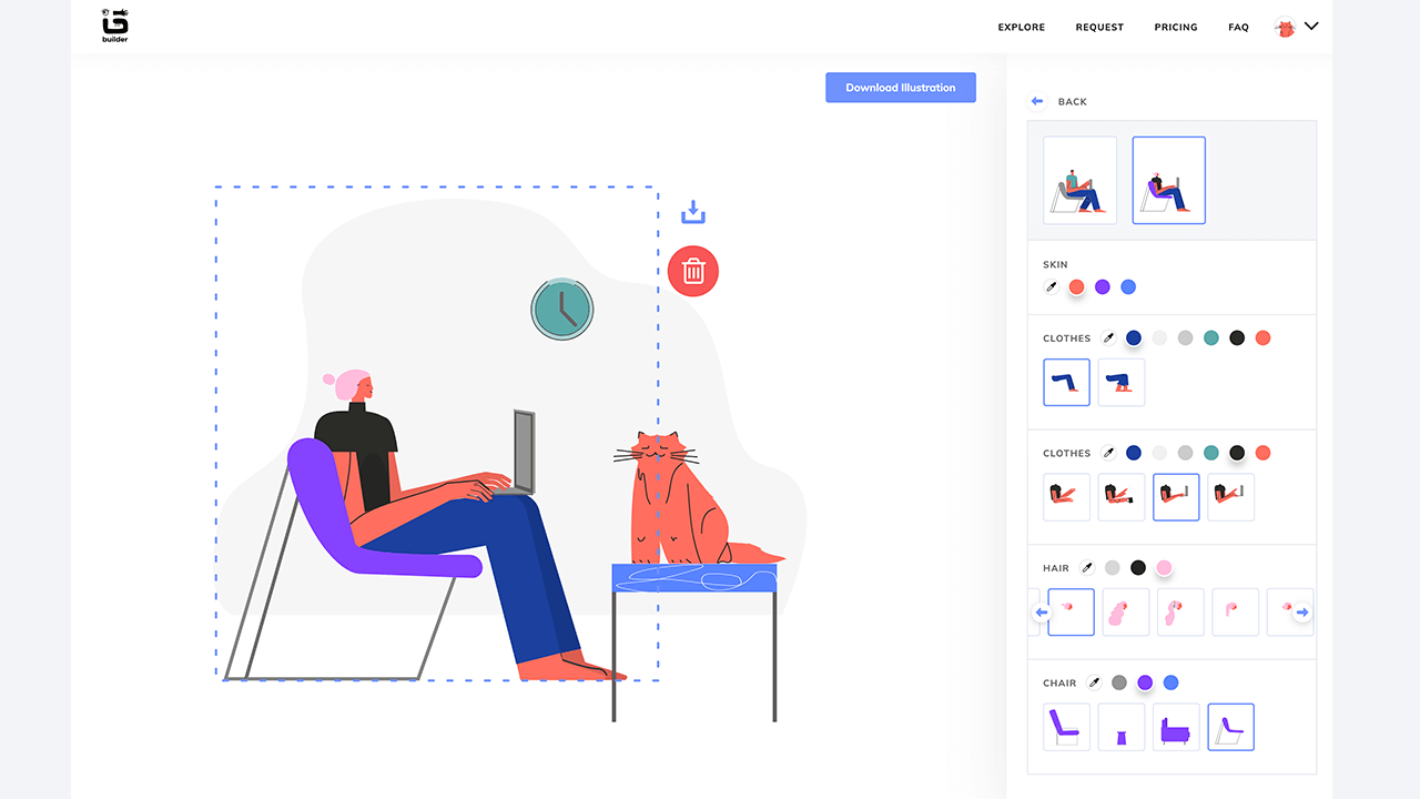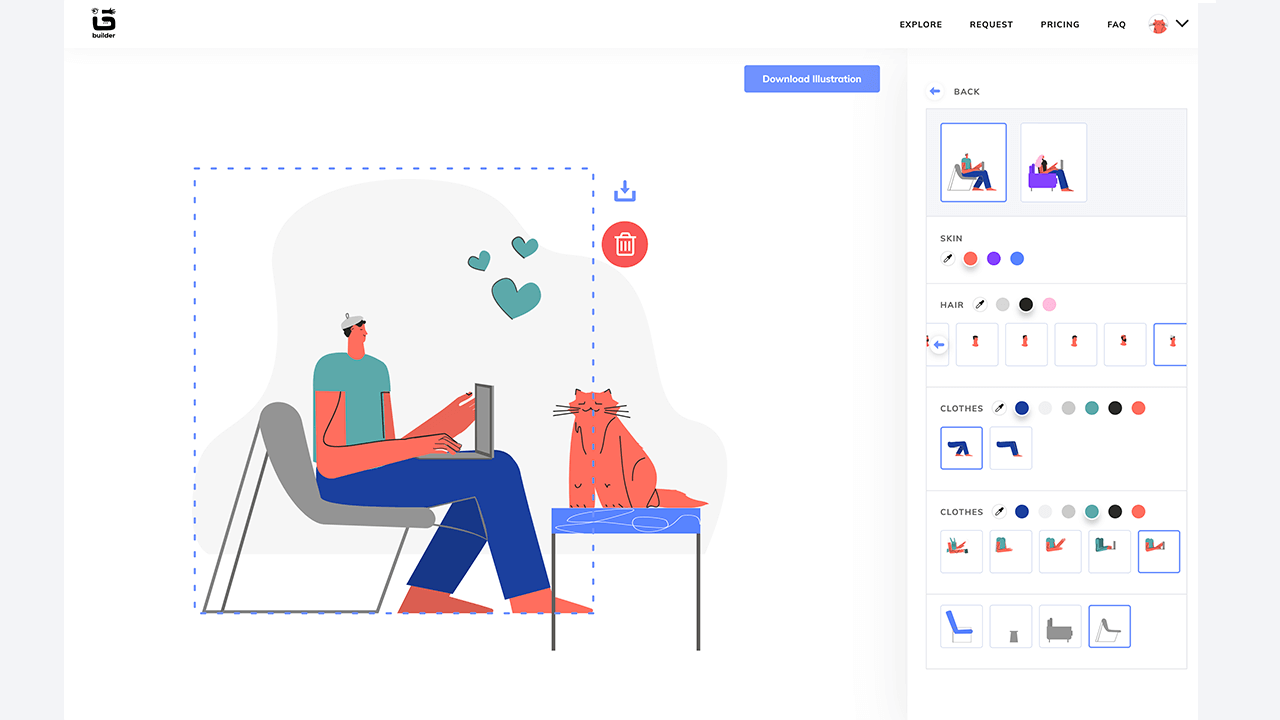 点击一个你满意的插画素材就可以进入在线构建器,你可以在右侧选择可定制的元素,比如人物的男女、皮肤、衣服、头发等等。