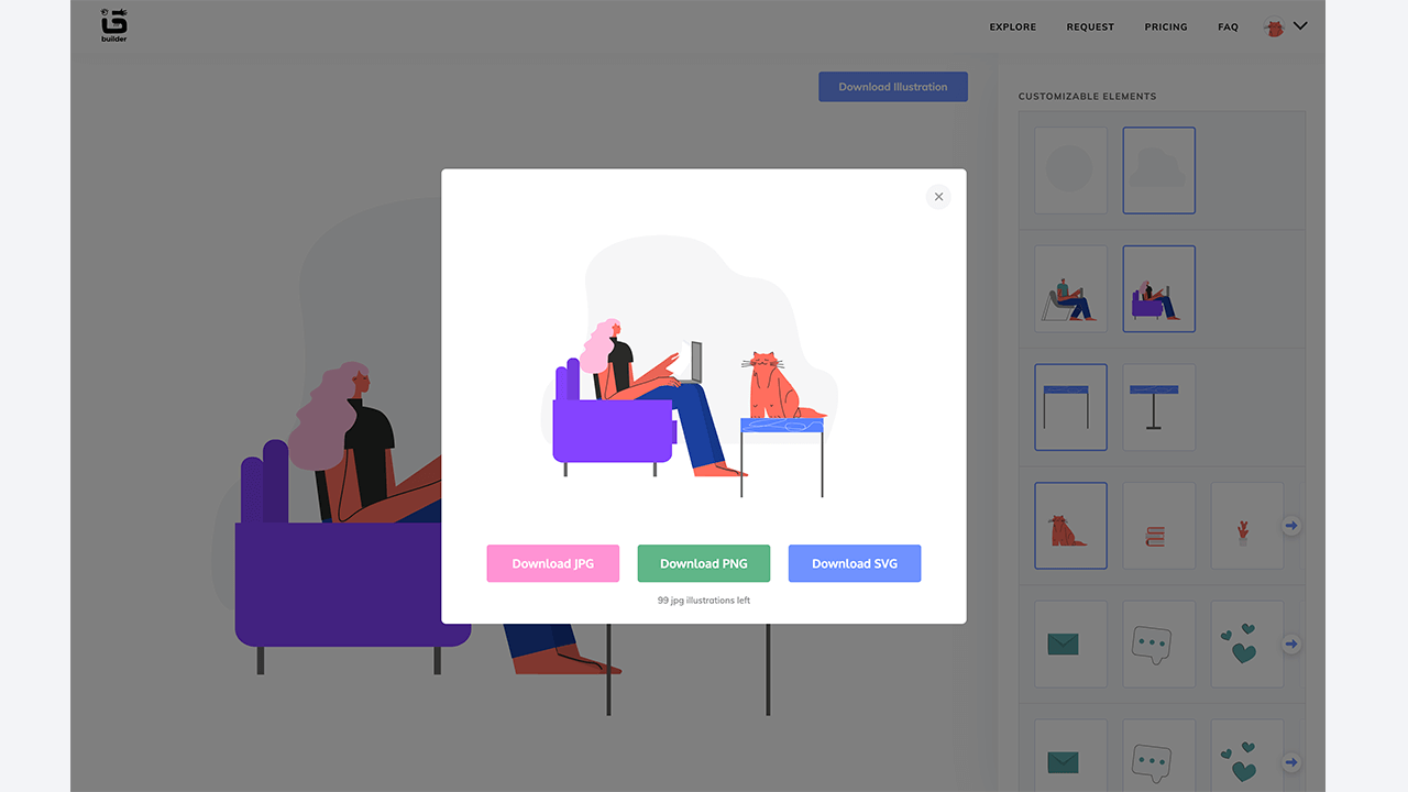 最后点击Download Illustration就可以直接下载自己定制的插画,这里提供了JPG、PNG、SVG三种格式,可以免费下载JPG格式,最多能下载100次且需要注明出处。