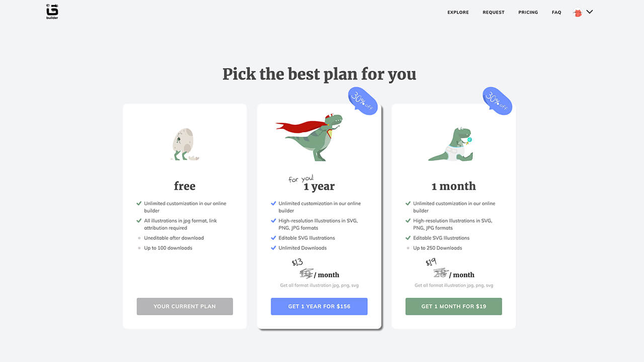 如果你想编辑SVG插画,则需要付费下载,这里提供了按月、按年的收费计划,可以获取JPG,PNG,SVG格式的插画。