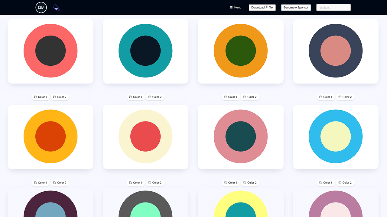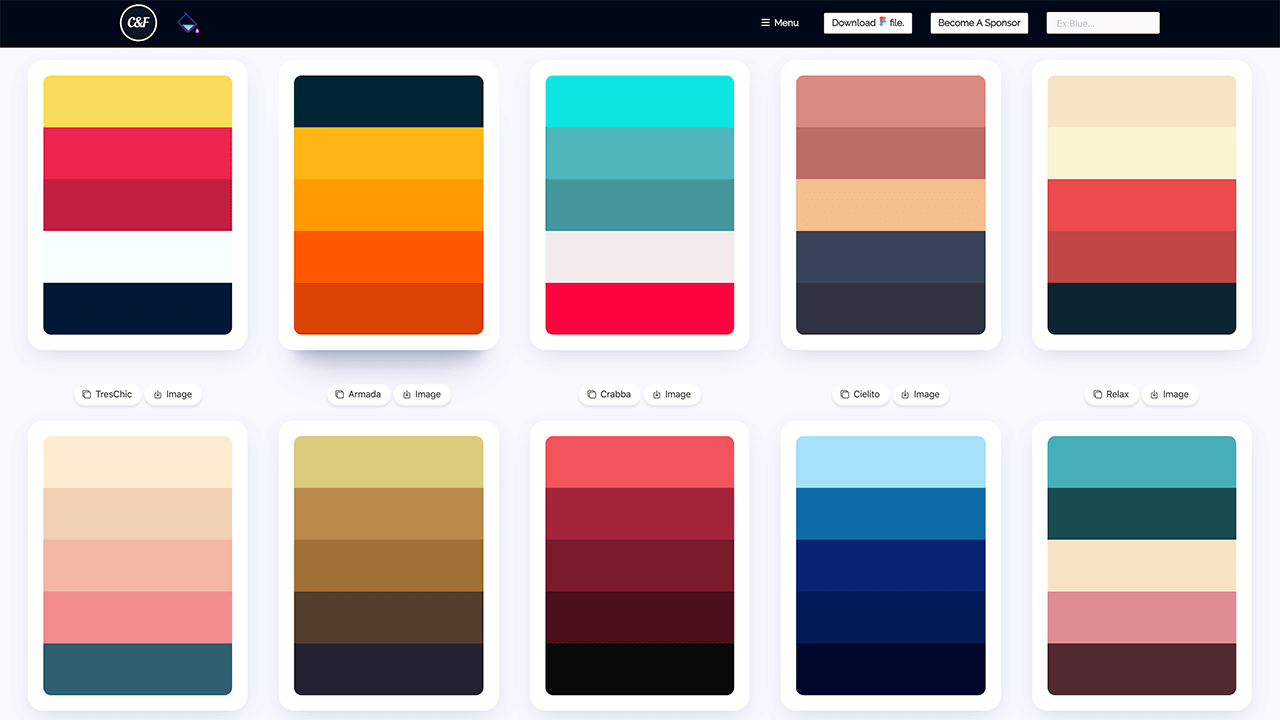 打开网站,可以看到提供的13个工具资源,比如第一个Color Palettes,它可以获取整个调色板的十六进制颜色,鼠标移动上去可以复制色值也可以下载调色板的图片。