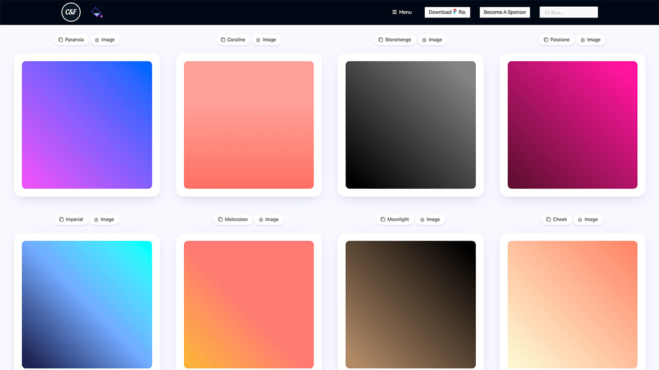 第二个Color Gradients,它是一个渐变色可以用作背景色,同样可以复制色值和下载渐变色的图片。