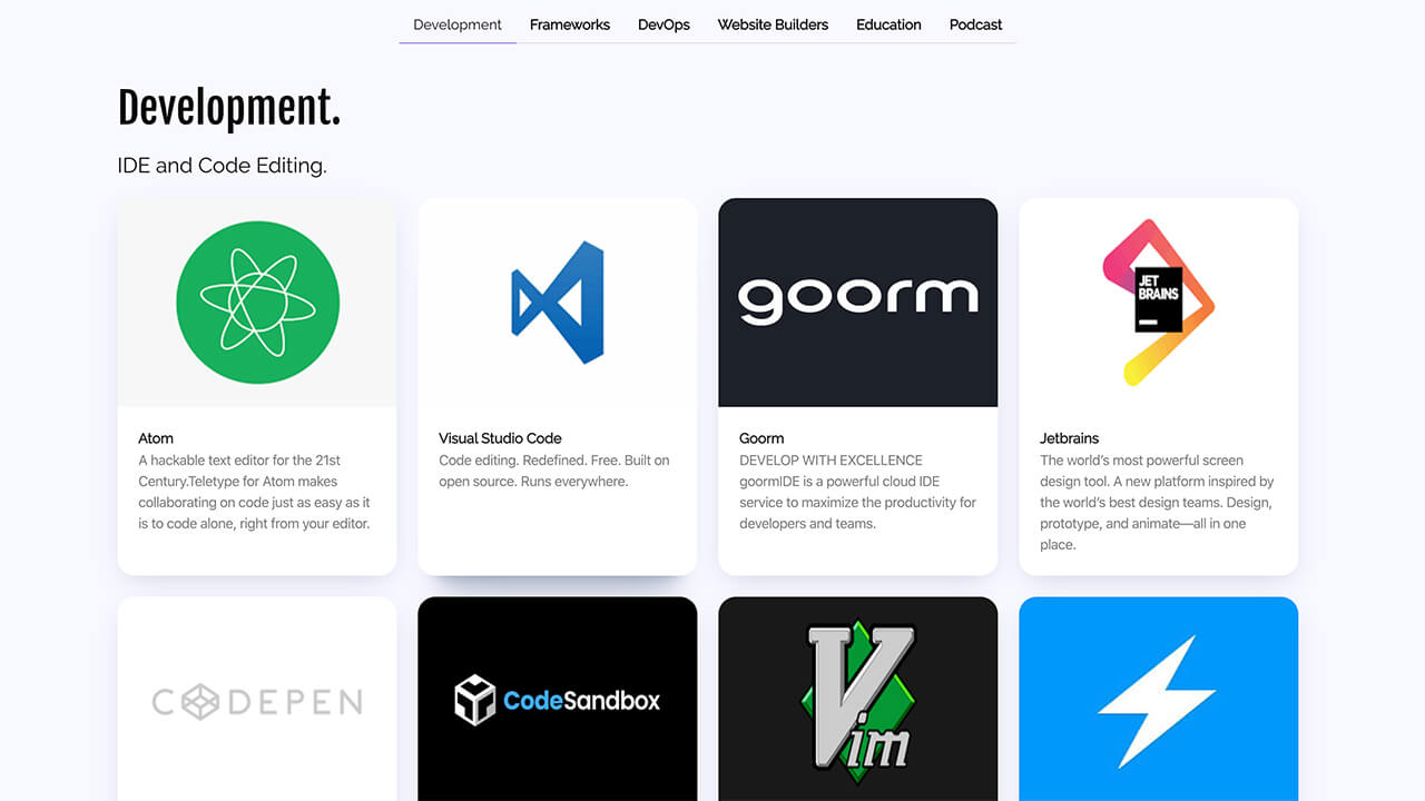 第九个Developers,这是一个针对开发者的资源,有开发工具、框架、网站构建工具等资源。