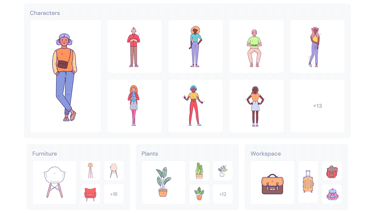 最后,网站上还提供了200+的元素组件,比如人物角色、家具、植物、工作、抱枕、图示等等。
