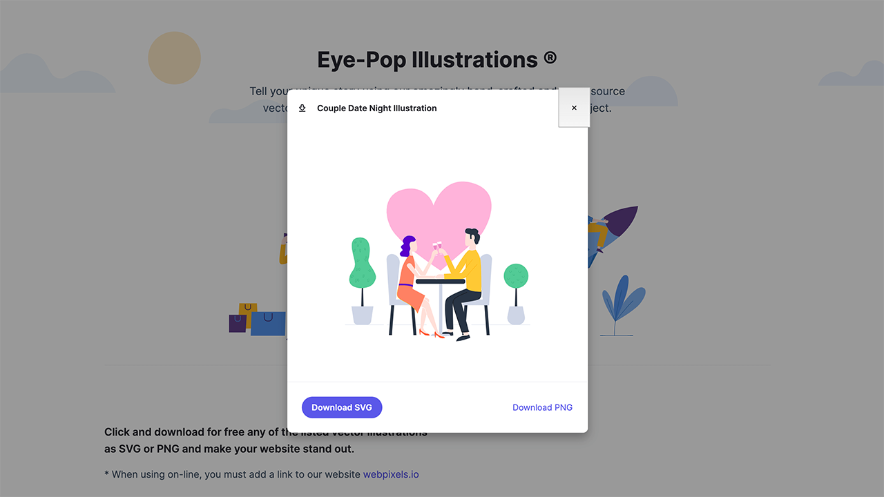 点击任意一个插画素材,可以免费下载SVG和PNG格式的矢量插画,可以免费用于个人和商业项目中(但需要注明出处)。