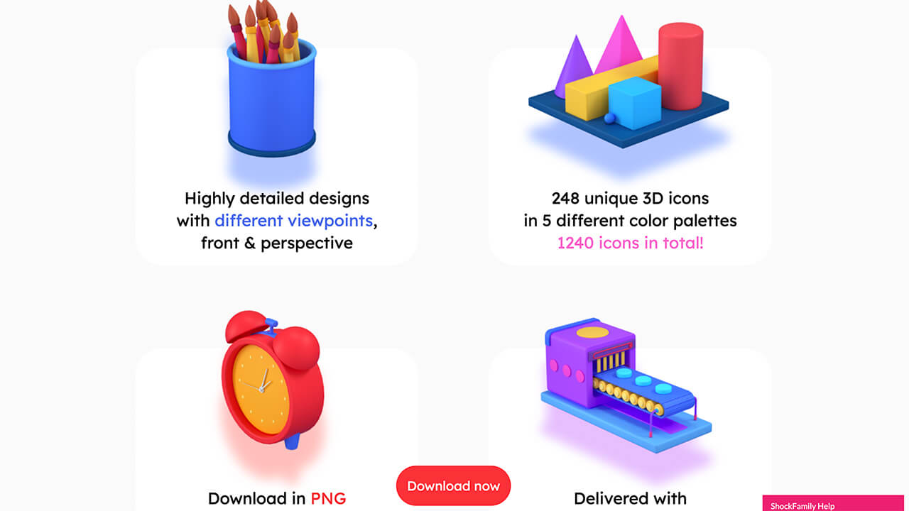 最后,网站上提供了大量的3D图标,免费用户可以下载50个图标,1个调色板。