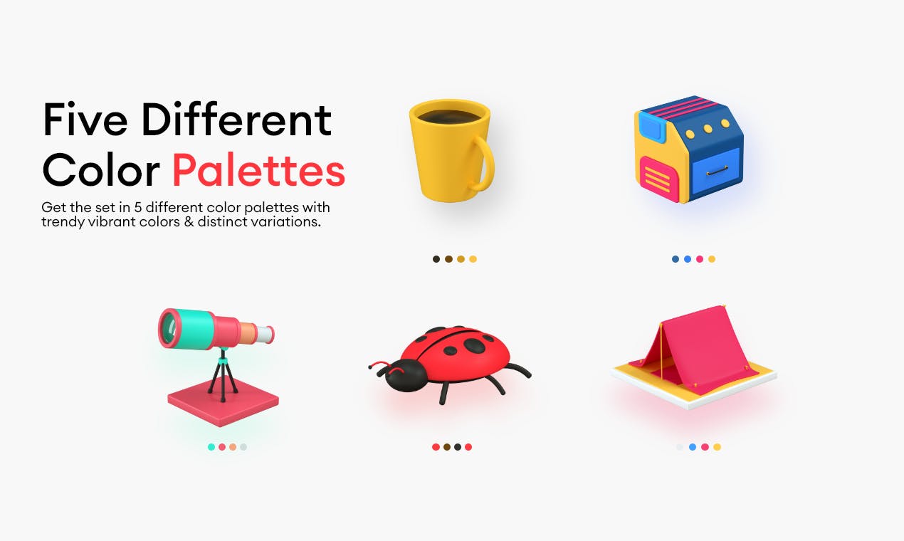 这些3D样式的设计具有不同的视角,5个不同调色板中的248个独特3D图标。