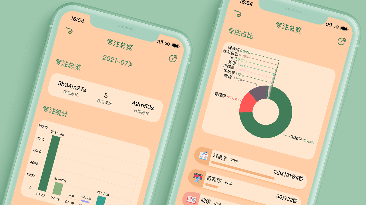 专注统计:柱状图清晰查看每天的专注时长,饼状图展示每个专注计划的占比,可以选择不同月份查看详细的专注总览情况。