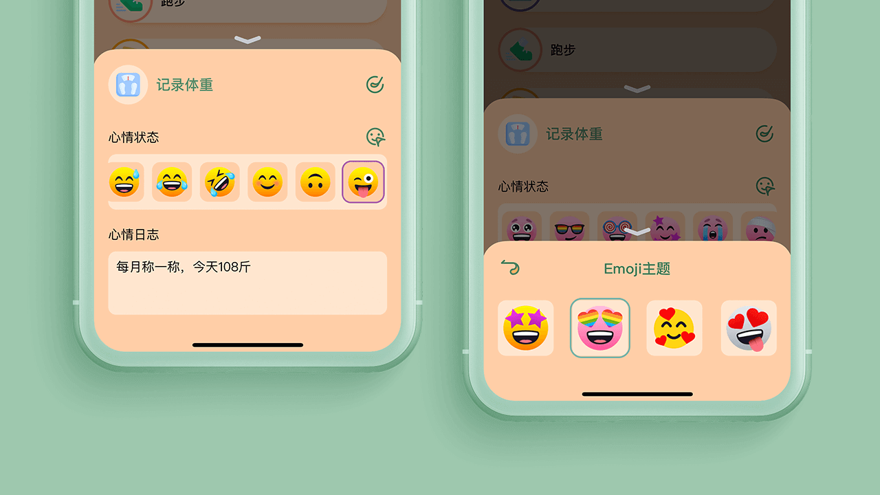 心情日志:习惯打卡支持输入日志,可选择不同的Emoji主题,可最多插入三张图片,可查看当天完成的习惯记录统计。