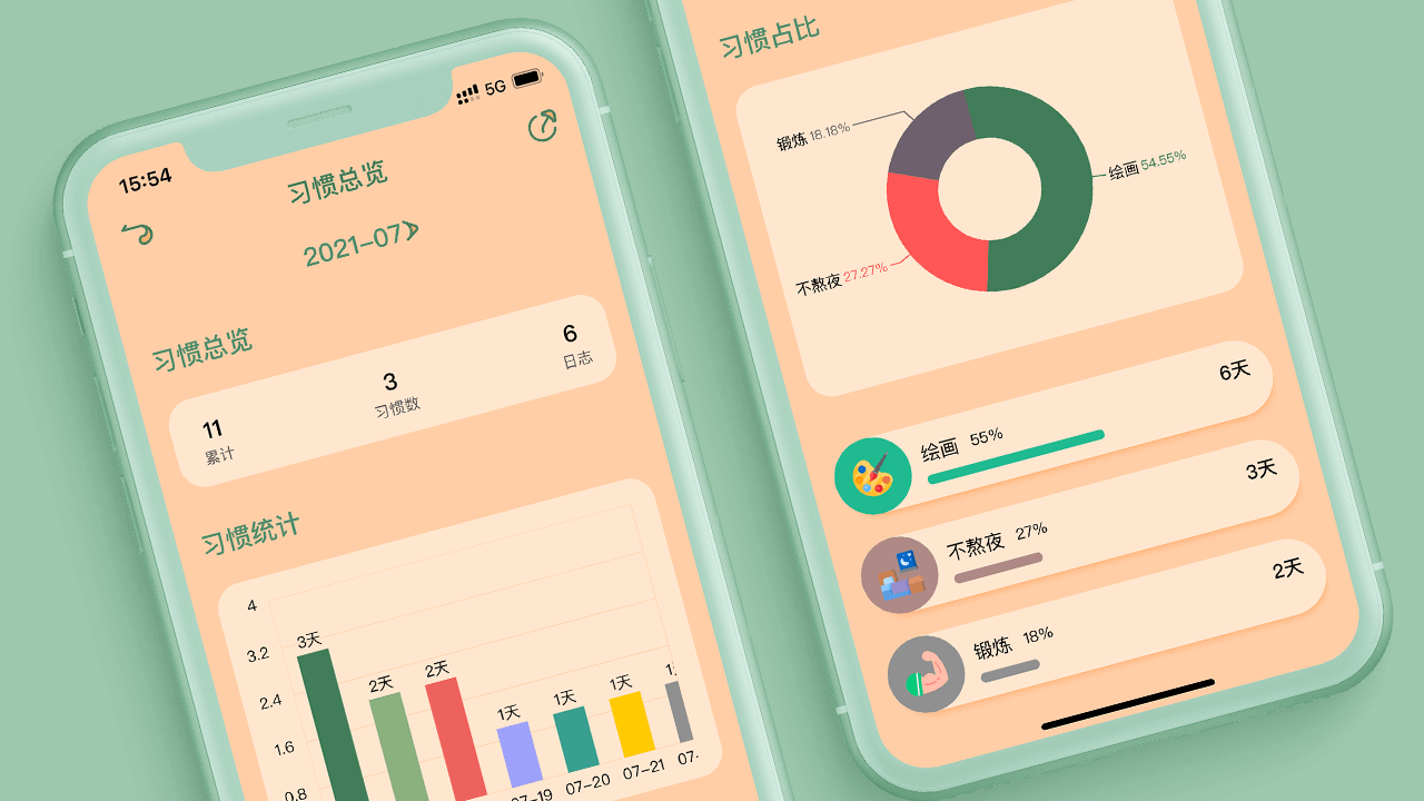 习惯统计:柱状图查看每天打卡习惯的天数,饼状图清晰查看习惯占比,同时也可查看每个习惯的累计天数、日志统计等等。