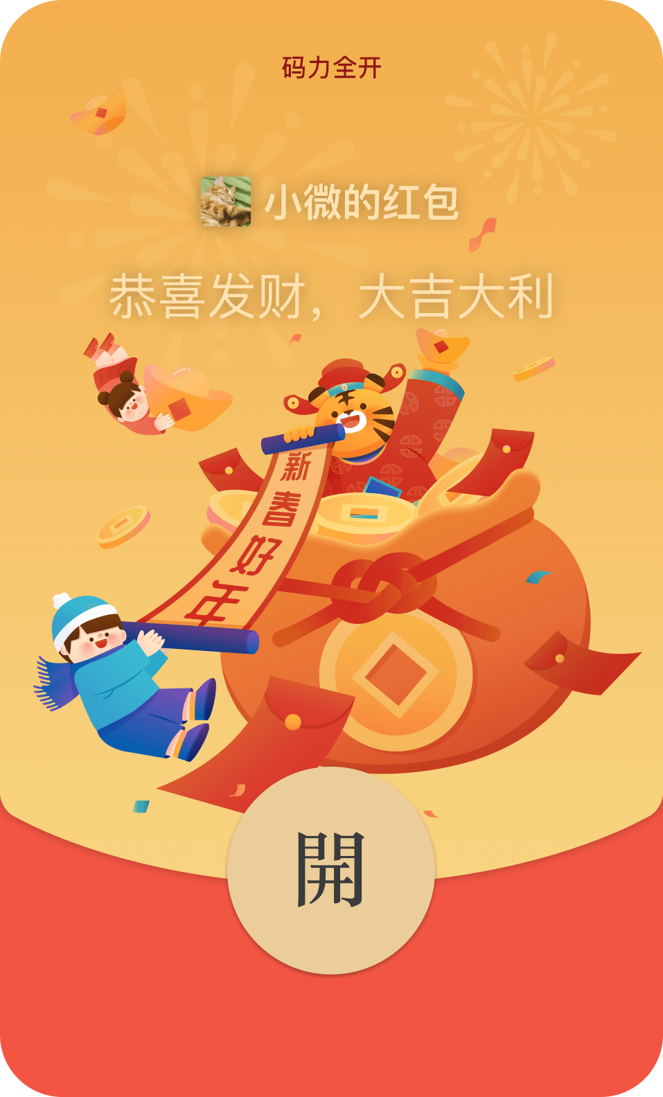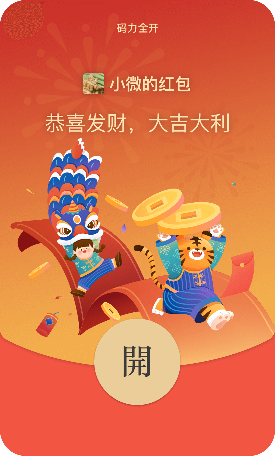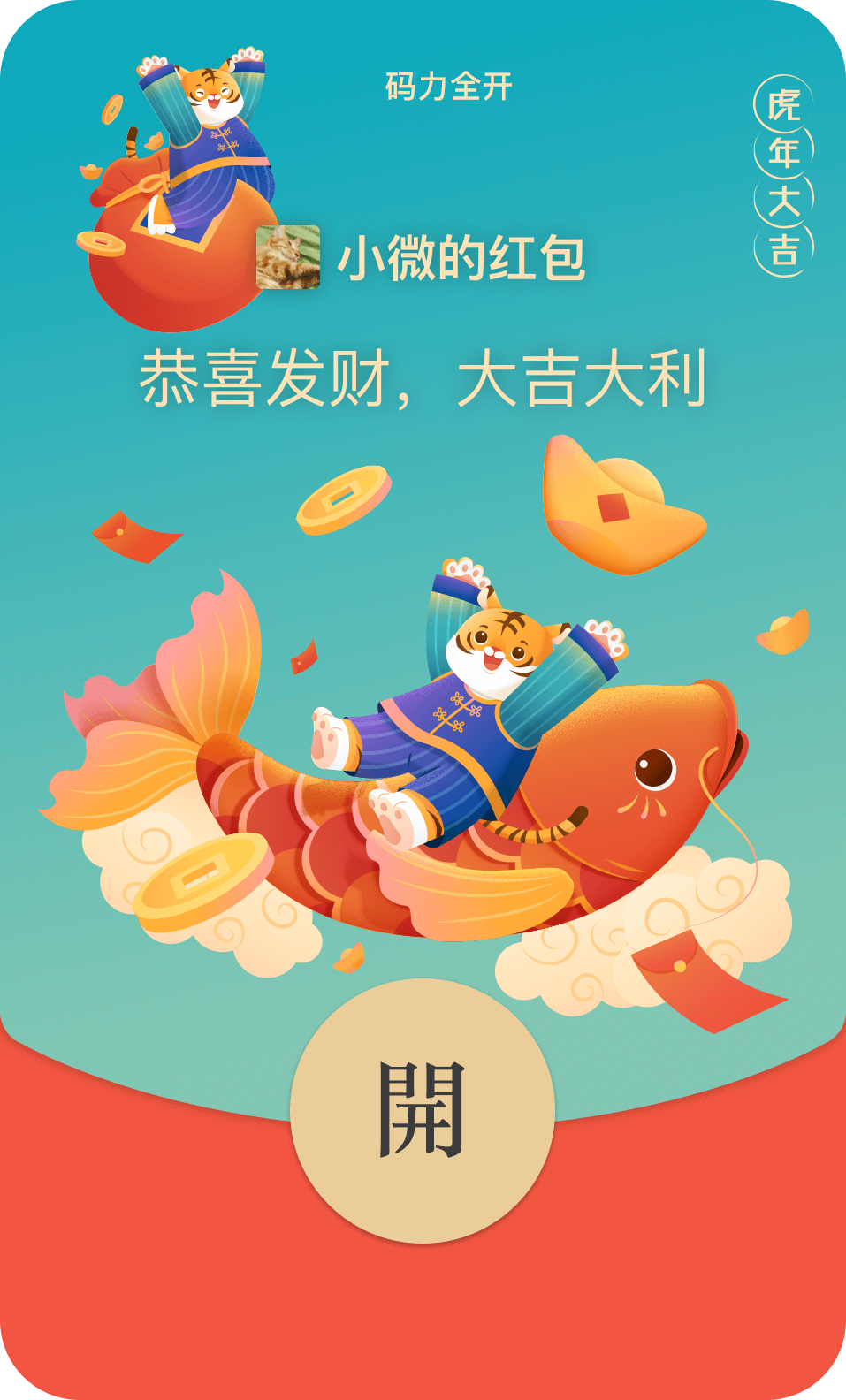 红包封面②:没领到?关注码力全开工作室公众号,即日起至1月31号每天下午15:00,在对话框回复暗号“虎年好运”,数量有限,先到先得。