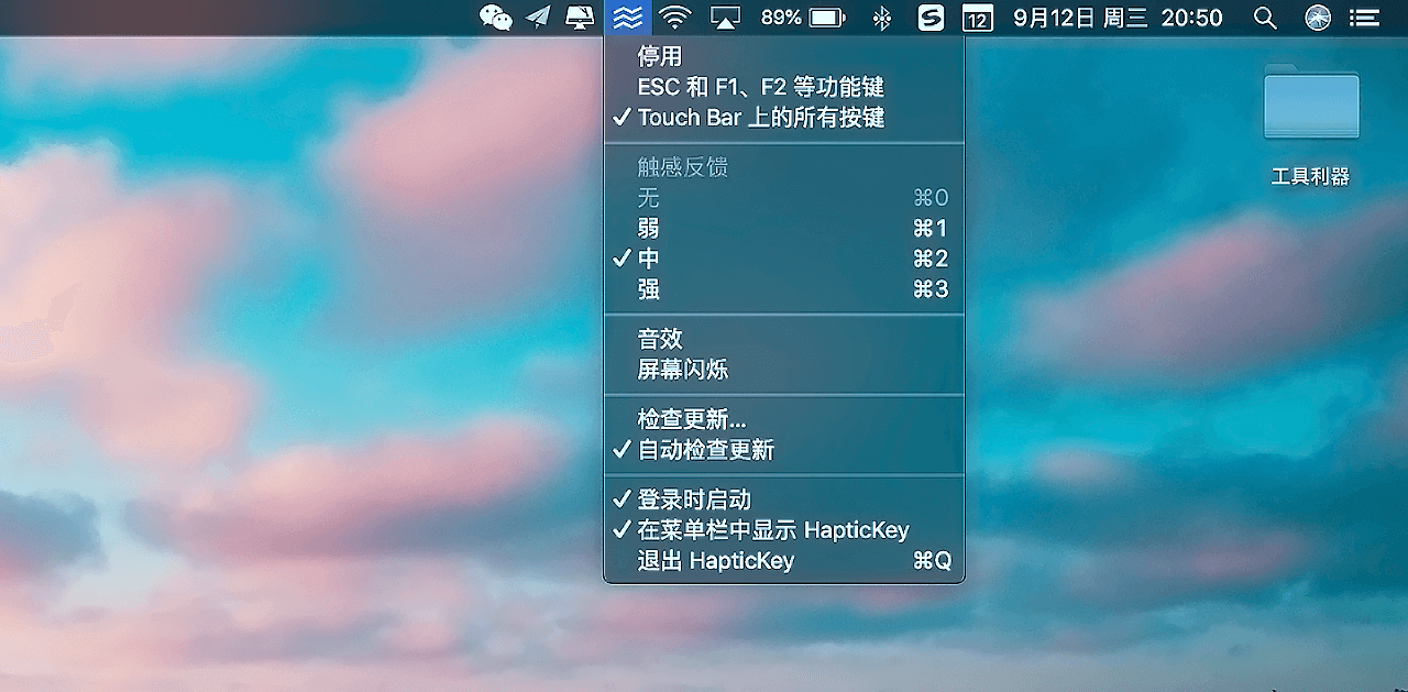 可以为你的Macbook Pro 带来 Touch Bar 触控反馈的工具,HapticKey 运行后默认不会自动启用,你需要去开启它的反馈功能,除此以外,你还可以使用音效和屏幕闪烁反馈,我使用后觉得效果不好,音效和屏幕闪烁还是别启用了。